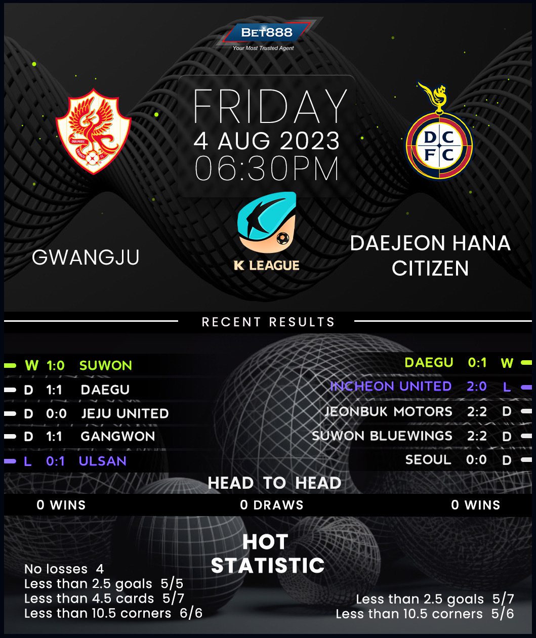 Meanwhile, despite lamenting a disappointing -2 goal difference, visiting Daejeon Hana Citizen clung to the final playoff spot with a hard-earned 1-0 home win over Daegu last time out. That result halted Daejeon’s woeful run of six winless league outings (D5, L1) and marked only their second clean sheet in 14 matches across all competitions. But Lee Min-sung’s men have faltered away from home, claiming just one win on their last seven competitive road trips (D4, L2), not to mention back-to-back scoring blanks in the build-up to this travel. That’s an ominous sign for the visitors, considering they’ve failed to get on the scoresheet on their last five visits to Gwangju (D3, L2).