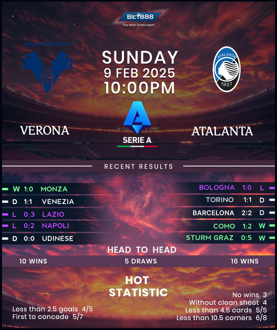 Hellas Verona’s battle for Serie A survival received a major boost last weekend as they squeaked past Monza 1-0 to steer three points away from the drop zone. As a result, they remain the team in Italy’s top flight to win each league match when breaking the deadlock this season (W5). Scoring first seems like a recipe for success in Verona’s case, yet they suffered an embarrassing 6-1 defeat in the reverse fixture, extending their winless run against Atalanta to five matches (D1, L4). That was also a sixth consecutive loss for head coach Paolo Zanetti, who bids to turn Verona’s miserable home fortunes around. Indeed, his charges have only won one point and scored one goal across their last five league outings at Marc’Antonio Bentegodi (D1, L4).