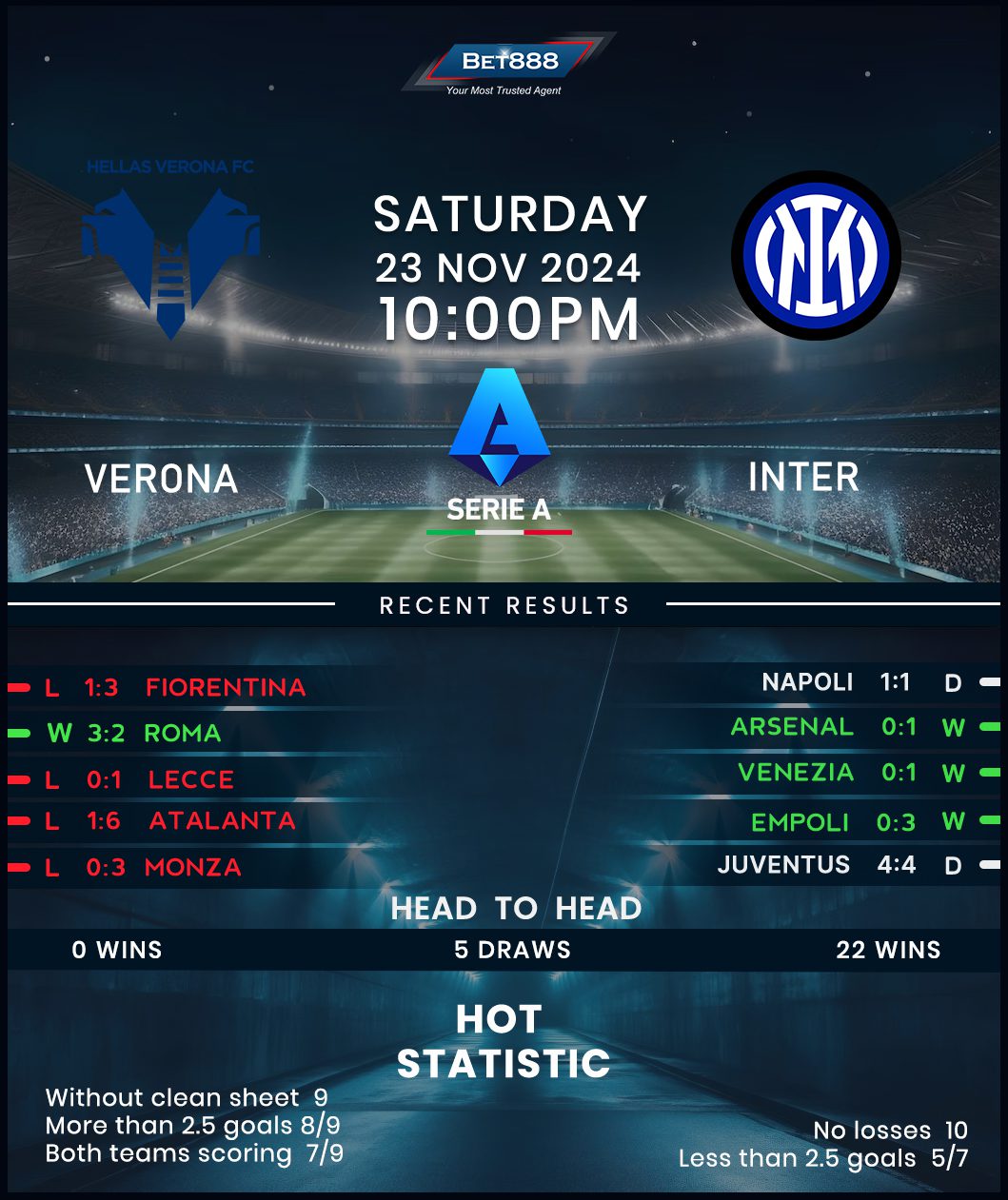 Moise Kean’s first hat-trick in the Fiorentina jersey condemned Hellas Verona to a 3-1 defeat on the stroke of November’s international break, inflicting a seventh loss on Paolo Zanetti’s side across their last nine league outings (W2). Interestingly, none of Verona’s 12 Serie A matches this season have ended all square (W4, L8), including a superb 3-2 victory against Roma in their last home outing. Despite the odds, ‘I Gialloblu’ will fancy their chances against Inter after proving their capacity to handle high-profile tasks with a scintillating 3-0 home triumph against table-topping Napoli on matchday one. However, Verona’s woes in this fixture are long-standing, as witnessed by a dreadful record of just four wins from 66 historical top-flight H2Hs (D22, L40).