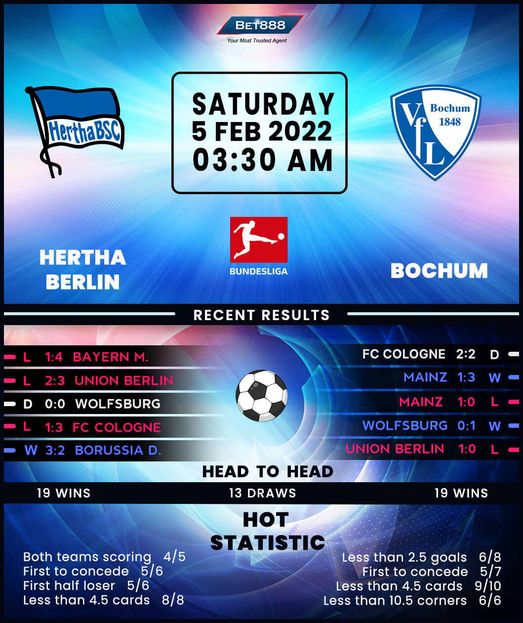 Two sides that have had identical returns from their last two Bundesliga games (D1, L1) are set to trade tackles at the Olympiastadion as Hertha Berlin take on Bochum.
