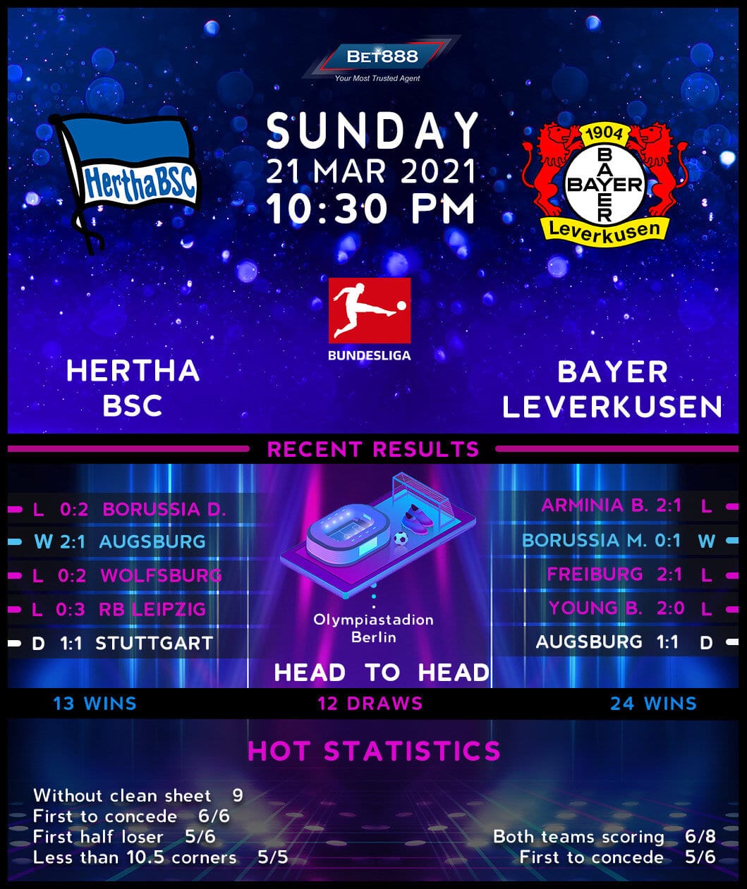 Hertha’s Bundesliga wobble continued last weekend with a 2-0 defeat at Borussia Dortmund, as they head into this encounter having won just two of their 12 league games since the calendar flipped to 2021 (D2, L8). A lack of firepower in the attacking third has seen ‘Die Alte Dame’ draw a blank in 58.33% of their Bundesliga fixtures this calendar year. Pal Dardai cannot take much comfort from his side’s defending in the recent period either. Hertha have failed to keep a clean sheet in any of their last nine league matches, setting the division joint-worst ongoing run in the process. Topically, only dead-last Schalke (26) have conceded more goals in home Bundesliga games this season than Hertha (24). By contrast, they have registered a shutout in each of their previous three top-flight meetings with Bayer.