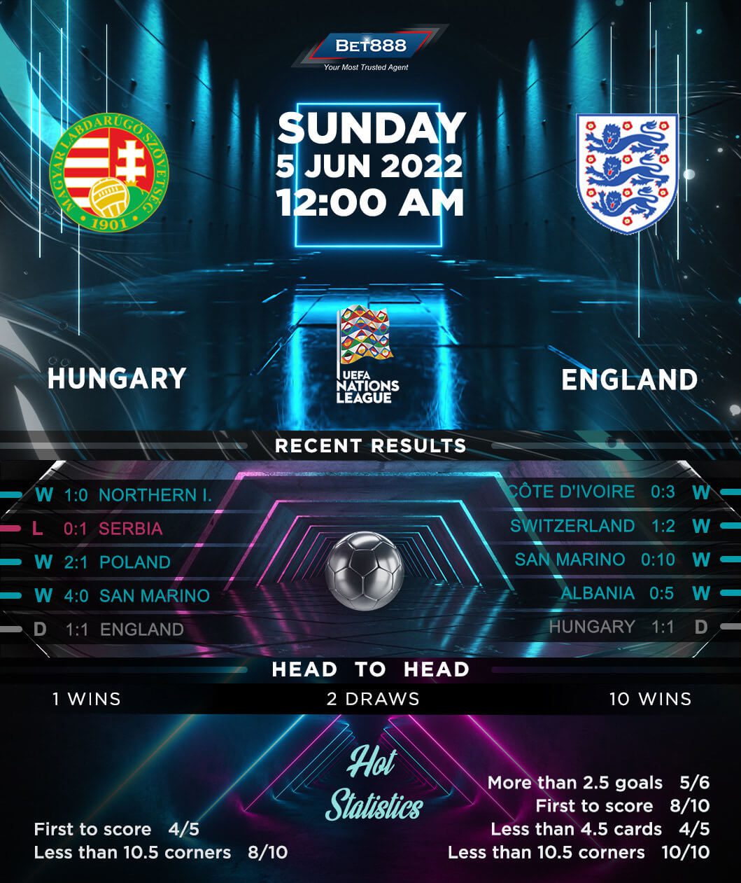 On the other hand, England come into this encounter seeking a fifth successive victory after winning both international friendlies in March by an aggregate score of 5-1. Stationed in fifth in FIFA’s rankings, Gareth Southgate’s men are unbeaten within 90 minutes across their last 22 games since losing 2-0 to Belgium in the Nations League back in November 2020. Adding to England’s confidence, they’ve only lost four of their 12 Nations League group stage fixtures (W6, D2). With some of the Premier League’s finest forwards at Southgate’s disposal, it comes as no surprise the ‘Three Lions’ have netted 35 goals across their last nine matches (W7, D2). Indeed, they’ve bagged 2+ goals in the last four in a row, at an average of five per game.