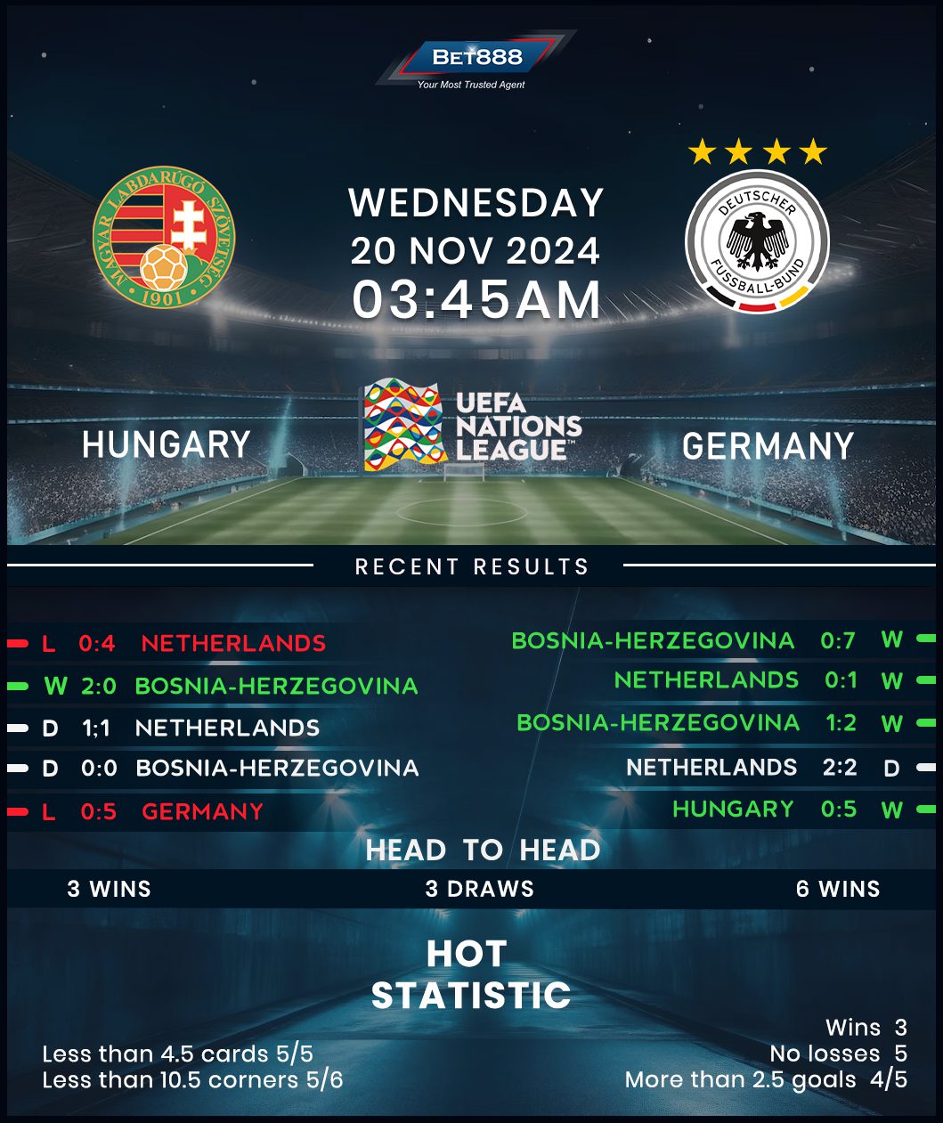 On the other hand, Germany’s emphatic 7-0 home triumph against the Bosnians in the penultimate round saw them lock down a top-table finish with a game to spare, upholding their near-flawless record in Group A3 (W4, D1). Furthermore, ‘Die Mannschaft’ trounced Hungary 5-0 at home on matchday one, solidifying their imperious H2H record since 1959 (W8, D6, D3). Through to the Nations League playoffs for the first time, Julian Nagelsmann’s lads head to Budapest eager to maintain an impressive run of not losing a match in regulation this calendar year (W10, D4). Indeed, Germany’s only defeat in 2024 came against Spain in extra time of their Euro 2024 quarter-final tie.