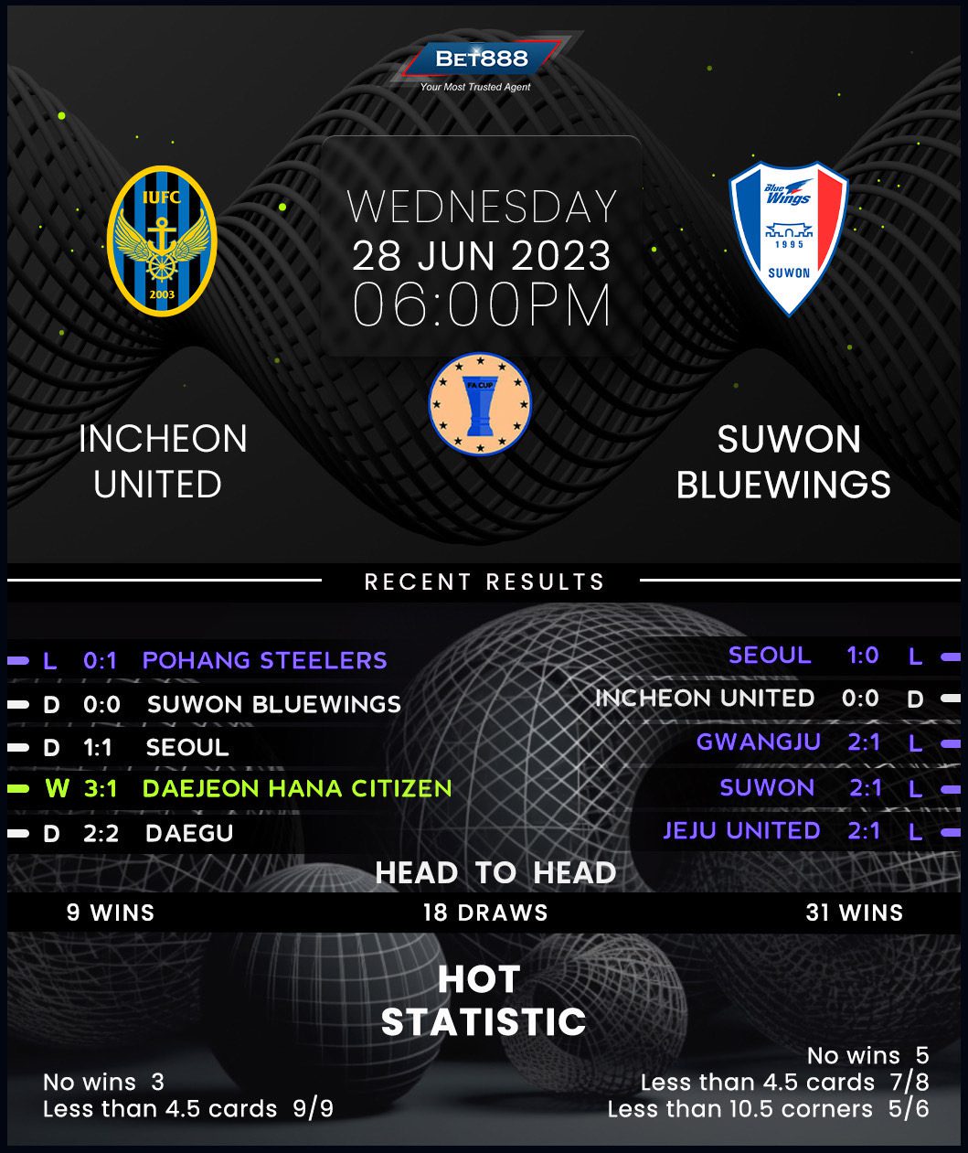 A place in the Korean FA Cup is on the line as Incheon United and Suwon Bluewings meet each other at the Sungui Arena Park in an exciting quarter-final tie.