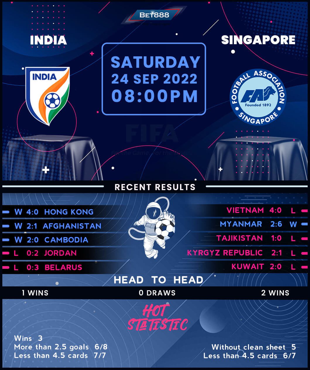 In the meantime, Singapore started September’s international break on the back foot, conceding three times beyond halftime in an embarrassing 4-0 defeat to Vietnam. The ‘Lions’ will be desperate for a form improvement after suffering four losses in their last five internationals (W1), three of which saw them fail to find the net. Playing on foreign soil has been difficult for Singapore as they’ve lost eight of their ten away internationals since the start of 2021 (W2). On the bright side, their solitary win in that five-game stretch was a 6-2 humbling of Myanmar, showing they can pack a punch on their day. Another positive for Takayuki Nishigaya’s team is that they’ve won three of their four previous meetings with India (L1), including the last two on the spin via an identical 2-0 scoreline.