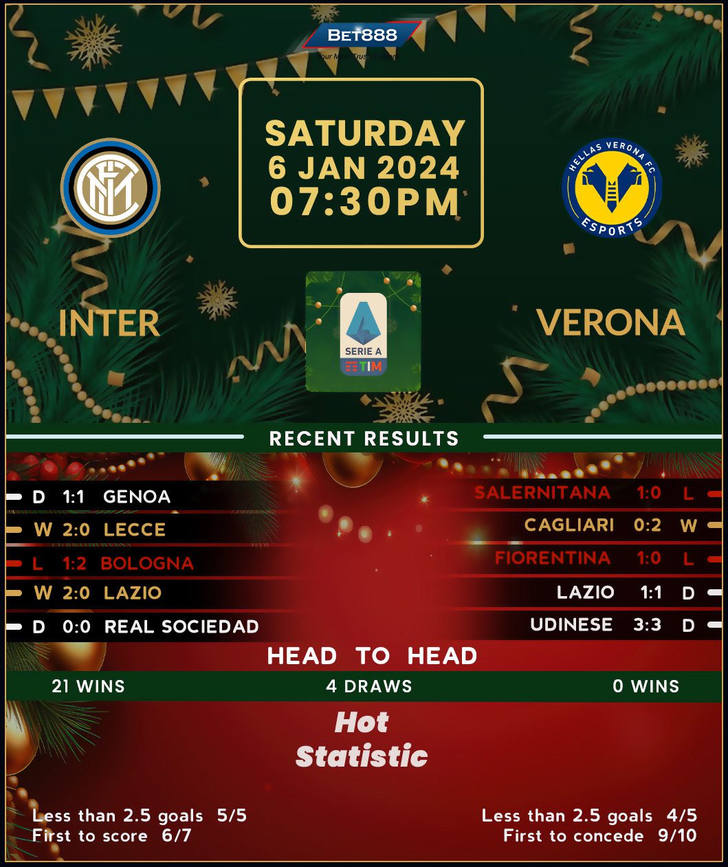 On the other hand, visiting Hellas Verona couldn’t wait for 2023 to end after a dismal 1-0 home loss to rock-bottom Salernitana sucked them back into a dreaded relegation scrap. Level on points with 18th-placed Cagliari, the visitors look doomed ahead of the kick-off, especially considering they failed to attempt a shot on target in that loss against Salernitana, an unwanted feat they last experienced in September 2021. Playing on the road won’t help Marco Baroni’s bid to avoid dismissal, with ‘I Gialloblu’ picking up just two points on their last seven Serie A travels (D2, L5). On top of that, Baroni has lost all four previous managerial fixtures against Inter, casting further doubt on the visiting side’s faint hope of staging an upset.