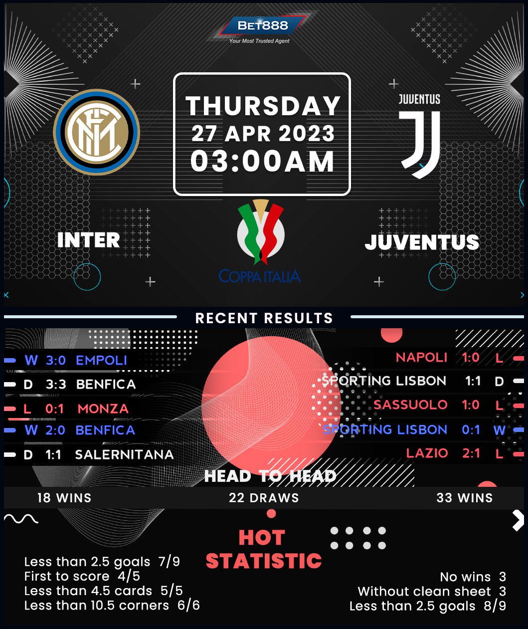 Interestingly, one of those matches that Inter failed to win was a 1-0 loss to none other than Juventus. The Old Lady has experienced a sudden reversal of fortunes lately. But, while their recent move back into the top four of Serie A after the acquittal of their points deduction was cause for celebration, the visitors’ joy was short-lived. Massimiliano Allegri’s men were defeated 1-0 by runaway leaders Napoli courtesy of Giacomo Raspadori’s stoppage-time winner in a game that saw two Juve goals disallowed. Having won the Coppa Italia a record 14 times, Juventus have reached the final in seven of the past eight seasons. However, ‘I Bianconeri’ must find a way to overcome their recent struggles on the road (D1, L2) if they’re to extend their three-game winning streak in Coppa Italia away matches.