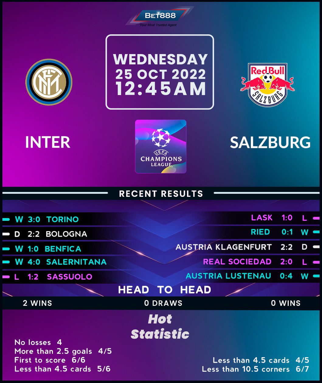 Fresh of returning to the top of the Serie A table with a 3-0 demolition of Torino at the weekend, last season’s Champions League beaten finalists are keen to maintain the unbeaten start to their Group D campaign (W1, D1). After fighting back late to draw 1-1 at Real Sociedad, Inter Milan squeaked past Benfica 1-0 at home last time out to begin their round as the joint-pacesetters alongside the Spaniards but only one point clear of third-placed Salzburg. Maintaining a near-perfect home record against Austrian opposition (W7, D1) would significantly bolster Inter’s chances of progressing beyond the Champions League group stages for the third season in a row. However, ‘I Nerazzurri’ cannot take anything for granted after delivering a mixed bag of performances in their last three competitive outings at Giuseppe Meazza (W1, D1, L1).