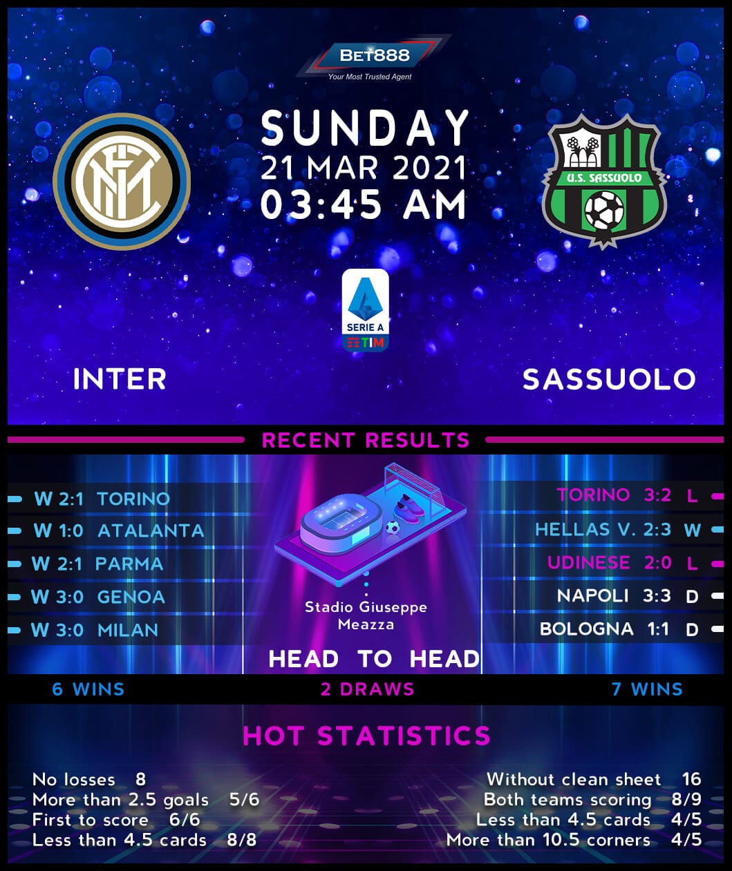 High-flying Internazionale and out-of-sorts Sassuolo will trade tackles at the Stadio Giuseppe Meazza in an exciting Serie A fixture.