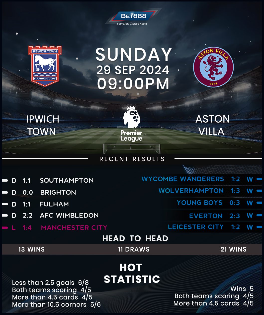 It’s been a difficult top-flight return for Ipswich. Kieran McKenna’s men hauled back a halftime deficit to hold fellow promoted rivals Southampton to a 1-1 draw last weekend. However, they head into proceedings as one of only six Premier League sides yet to win after six league matches (D3, L2) while lamenting the division’s second-worst scoring record. As only one of Ipswich’s three league goals this season came at home, the impending return to Portman Road may not help the Tractor Boys arrest a six-game winless run in all competitions. A seventh consecutive game without a win would mark their longest wait for a victory since September 2021, and the opposition couldn’t be more formidable. Indeed, they’ve only won one of the last 14 matches against Aston Villa (D3, L10).