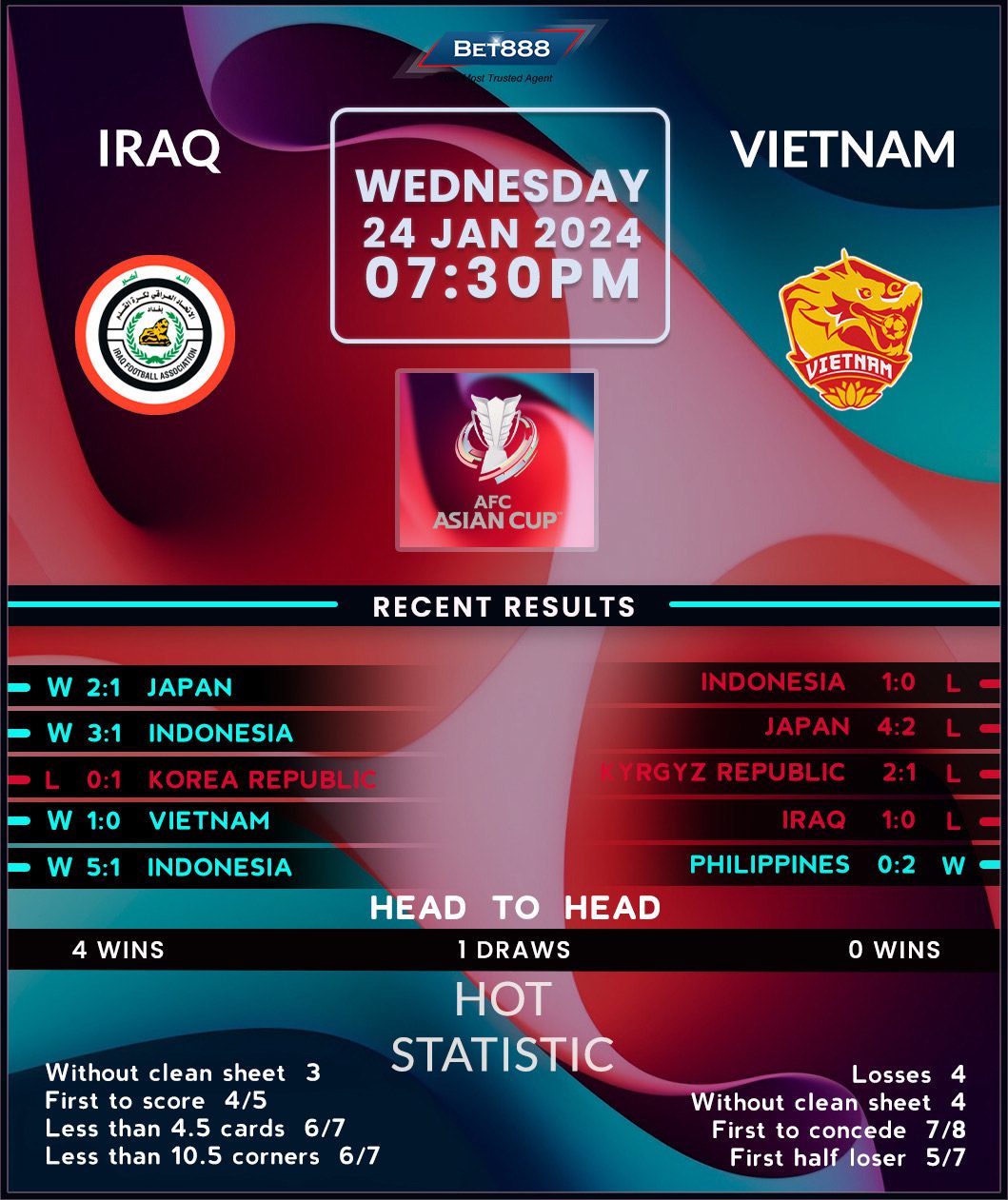 On the other hand, Vietnam’s hopes of progression hinge on taking three points in this fixture after losing their opening two Group D assignments. While a 4-2 defeat to Japan in a curtain-raising contest wasn’t a surprise by any stretch of the imagination, the ‘Golden Star Warriors’ performed below average in a flat 1-0 loss to Indonesia in the previous round. With four consecutive defeats painting a bleak picture in the build-up to this ‘make or break’ showdown, Vietnam’s chances of reaching the Asian Cup knockouts for the fifth time in their six appearance in the tournament look dead in the water. But if head coach Philippe Troussier can become the first-ever Vietnam boss to claim a win against Iraq (D1, L4), they could still progress as one of the best-ranked third-placed teams.
