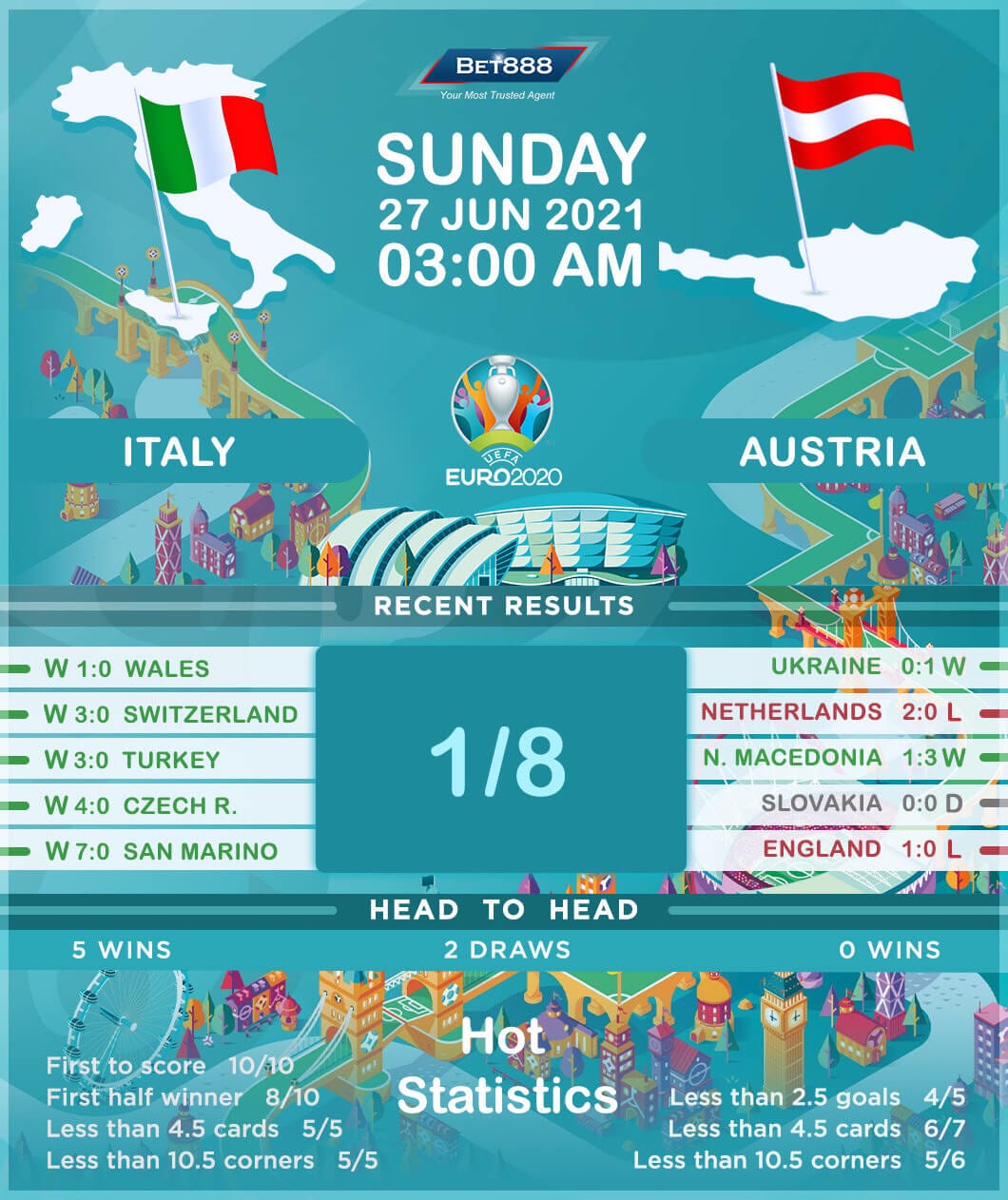 It’s been a stunning Euro 2020 journey for Italy so far, as they finished top of Group A with all three wins and an intimidating +7 goal difference (GF:7, GA:0). Indeed, the Italians have qualified for the knock-outs as one of only two sides alongside England to keep a clean sheet in all three group stage fixtures. Ahead of the kick-off, Roberto Mancini’s men are unbeaten in their previous 30 international games (W25, D5), winning each of the last 11 in a row without conceding once. If they manage to keep Austria at bay, Italy will record their all-time longest run of 12 consecutive clean sheets. At the other side of the pitch, ‘Gli Azzurri’ attempted an average of 20 shots per game across their three group stage matches at Euro 2020, their highest ratio at the European Championships since 1980.