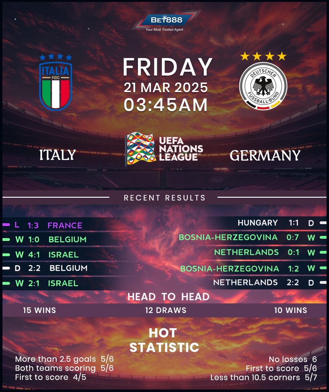 On the other hand, Germany strolled to a top-table finish in Group A3 ahead of the Netherlands (W4, D2), netting an eye-catching 18 goals in six matches! That’s largely thanks to landslide victories against Bosnia (7-0) and Hungary (5-0). However, it takes nothing away from Germany’s renaissance under Julian Nagelsmann. Except for a controversial loss to Euro 2024 winners Spain in last summer’s tournament, ‘Die Mannschaft’ haven’t lost any of their 14 remaining internationals since the start of 2024 (W10, D4). Brimming with confidence, Germany will be out to post their first away win against Italy since 1986.