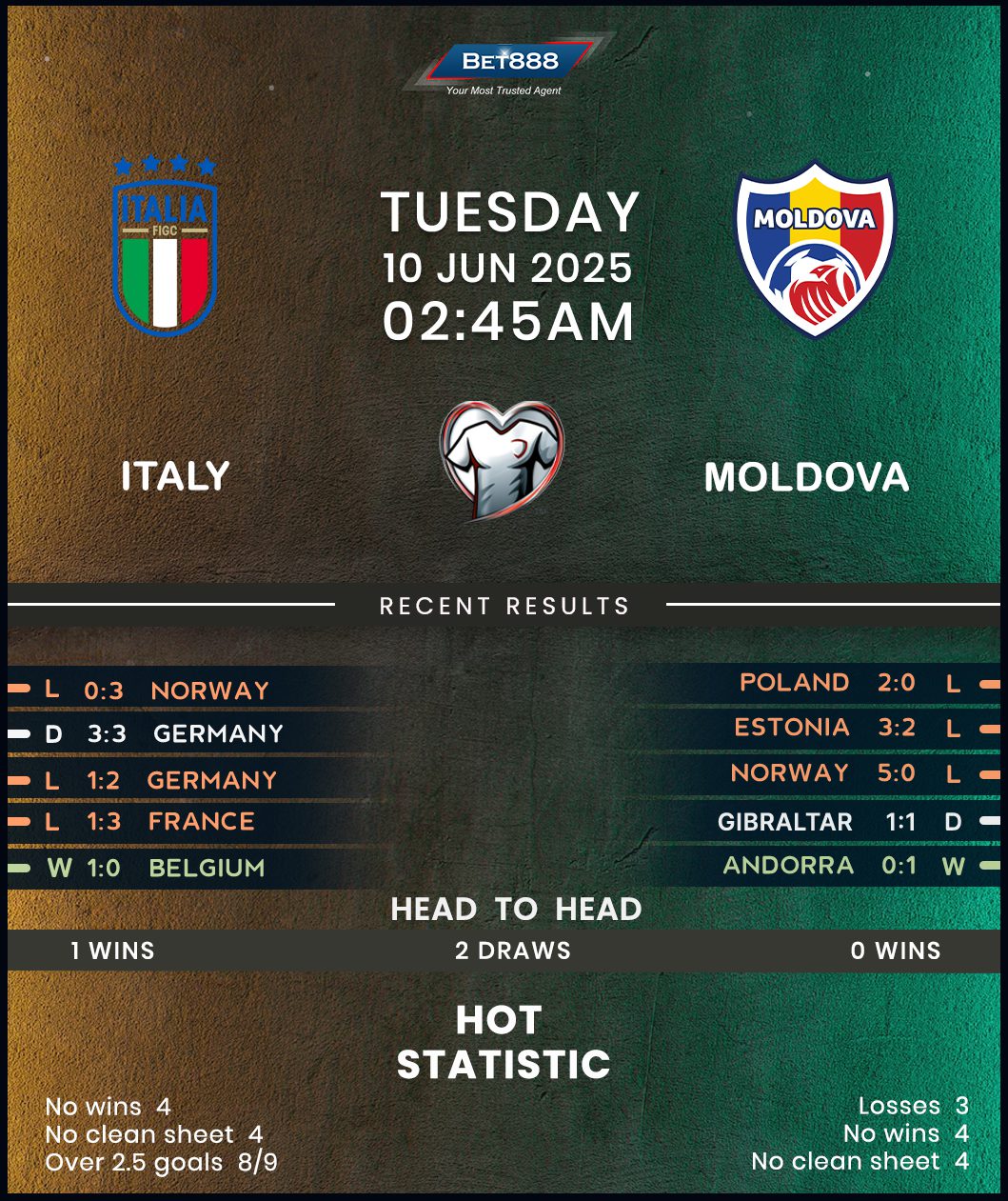 Meanwhile, Moldova’s hopes of securing World Cup qualification as an independent nation for the first time are already dead in the water after a disappointing start to their qualifying campaign. Indeed, they started with a 5-0 rout to Norway at home before losing to Estonia 3-2, stretching their wait for a World Cup qualifying win to October 2013 (D3, L19). Therefore, their chances of upsetting the odds in Italy look slim, especially considering they’ve lost all five previous meetings with Gli Azzurri, conceding multiple goals in four! A 2-0 friendly loss to Poland in the build-up to this trip doesn’t bode well either, casting further doubt on the visitors’ quest to defy an unimpressive seven-game form on foreign soil (D2, L4).