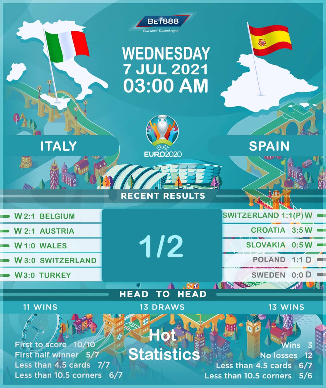 Meanwhile, the Spaniards squeaked into the semi-finals after beating Switzerland in a nerve-shredding penalty shoot-out, returning among the top four at a major tournament for the first time since lifting the World Cup crown in 2012. If this tie takes to penalties, ‘La Furia Roja’ will be confident of making it through, as they’ve progressed via penalties at the European Championships on more occasions (4) than any other nation. Additionally, each time Spain reached the semi-finals, they went on to win the tournament, doing so in back-to-back Euros (2008 and 2012) and the 2010 World Cup. But, they have to be wary of winning just one of their previous nine encounters at major tournaments (D4, L4), losing their most recent such fixture 2-0 in the Euro 2016 last-16. On the bright side, Luis Enrique’s men take the field unbeaten in 13 consecutive internationals (W7, D6) despite scoring 2+ goals in just 46.15% of those games.