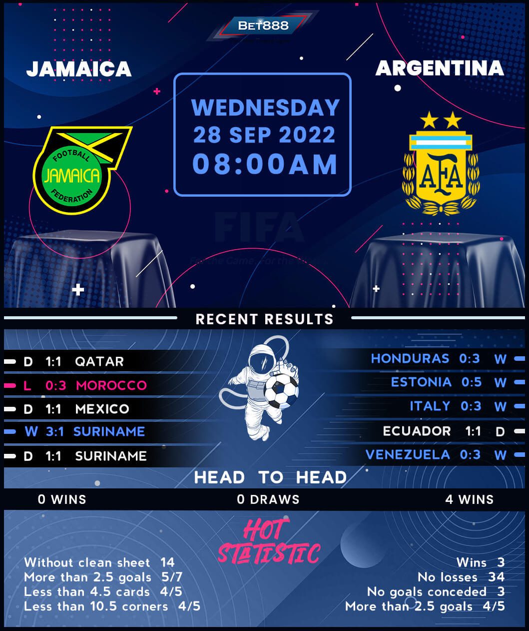 On the other hand, inspired by Lionel Messi’s double, high-flying Argentina brushed Honduras aside with an overwhelming 3-0 win last time out, extending their phenomenal unbeaten streak to 34 consecutive matches (W24, D10)! Three fixtures away from equalling Italy’s world-record 37-game run, Lionel Scaloni’s men conquered Copa America and Finalissima trophies during that sequence, bolstering their confidence ahead of the Qatar World Cup. Speaking of Argentina’s imperious run of form, they have racked up four wins from five internationals since the start of March (D1), all of which came by 3+ goals ‘to nil,’ summing up their purple patch in a nutshell. Nothing should change here as ‘La Albiceleste’ have won their three previous H2Hs against Jamaica by an aggregate score of 8-1.