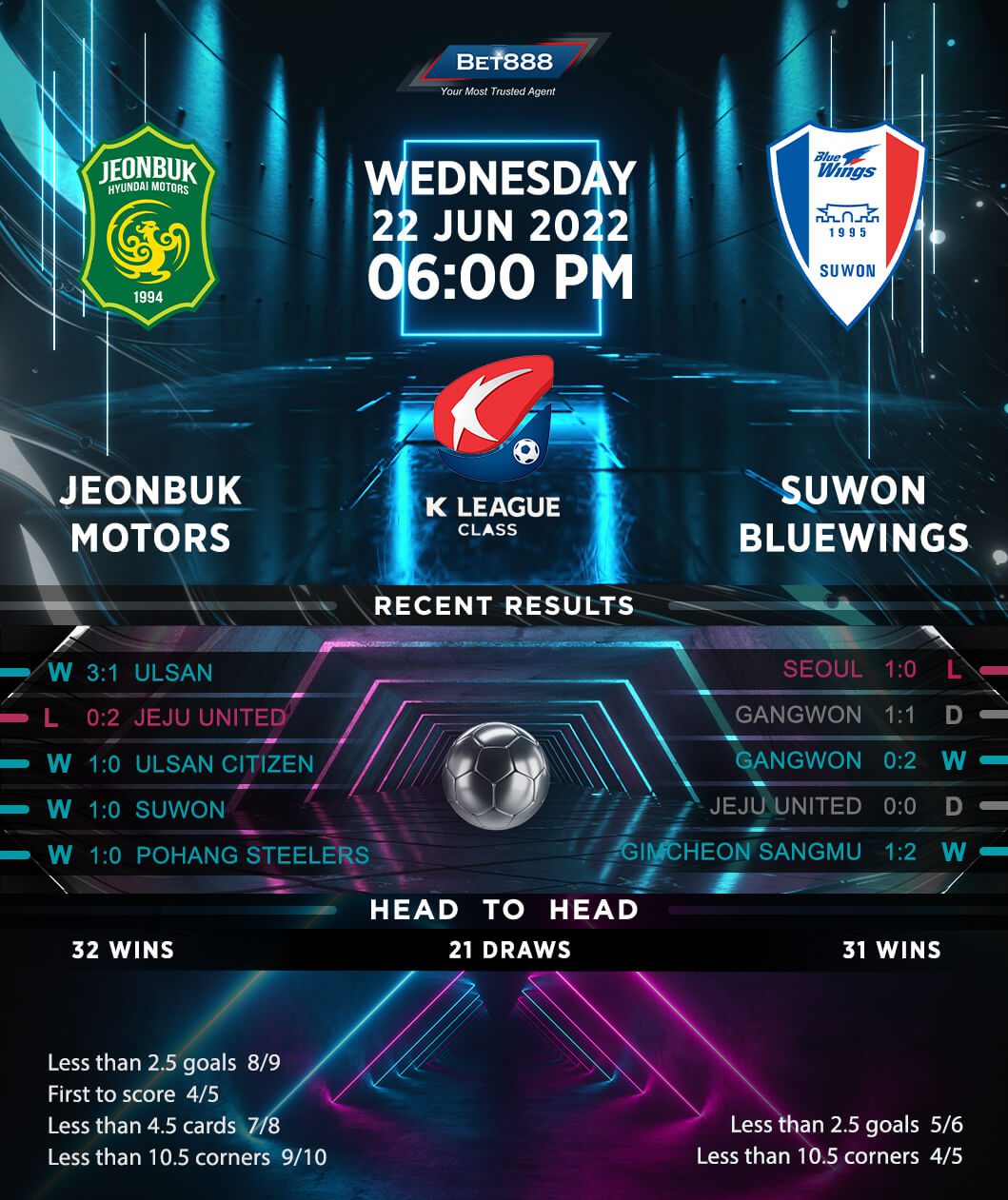 On the other hand, Suwon Bluewings slipped to a 1-0 home defeat to Seoul last time out, ending a decent run of four unbeaten K League 1 matches (W2, D2). Based on the visitors’ underwhelming away form, they are unlikely to return to winning ways here. Indeed, the ‘White and Reds’ are winless in all seven league fixtures on the road this term (D4, L3), netting a measly average of 0.57 goals per game. Moreover, except for a 3-1 win in May 2021, Suwon have lost three of their last four top-flight visits to Jeonbuk without scoring.