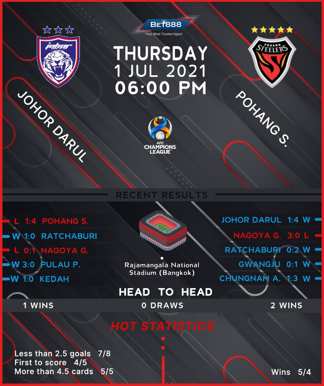 Pohang Steelers head to the Sultan Ibrahim Stadium to take on Johor Darul Ta’zim, looking to secure all three points and consolidate a top-two finish in the AFC Champions League Group G.