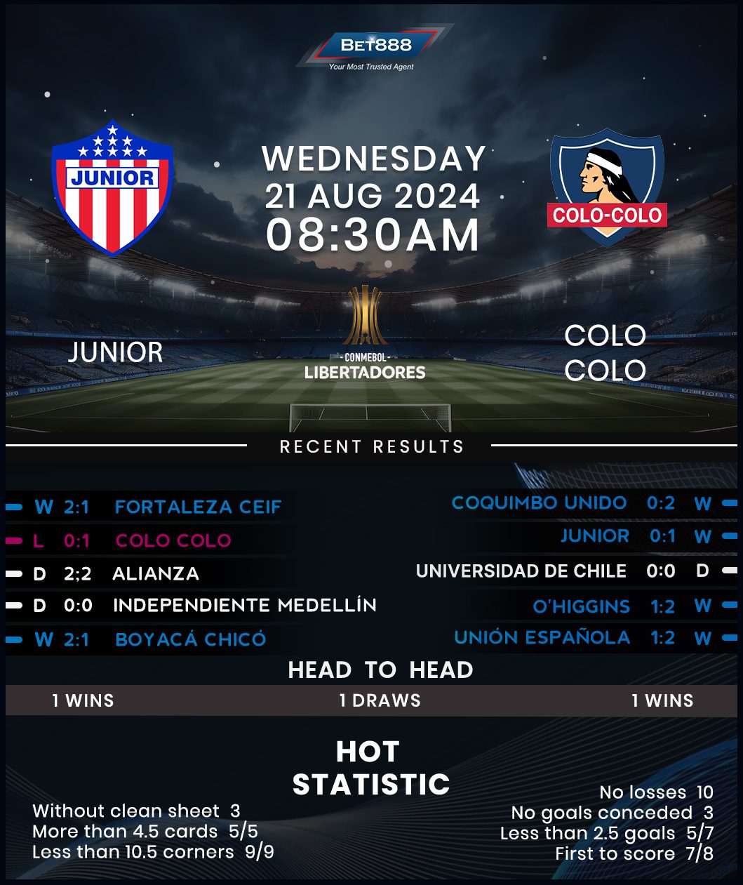 Junior can consider themselves lucky for being alive in this tie after being outclassed in the first leg but still losing just 1-0. They faced 16 shots, including five on target, while only attempting one themselves before steadying the ship with a 2-1 league win against Fortaleza. Fresh off halting a three-game winless run in competitive action (D2, L1), the 2018 Copa Sudamericana runners-up are confident about turning this tie on its head, relying on their five-game unbeaten home run (W3, D2) to carry them through. However, Junior’s notoriously inconsistent performances at the Metropolitano Roberto Meléndez have seen their last ten competitive outings at this venue alternate between different outcomes (W5, D4, L1). The only common denominator in this stretch has been a ‘both teams to score’ theme, which saw both sides on the scoresheet in seven of those ten matches.