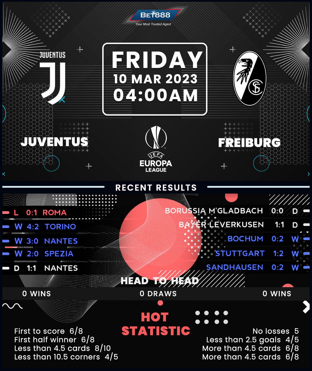 On the other hand, Freiburg finished top of Europa League Group G without losing a match (W4, D2) while boasting an eye-catching +10 goal difference (GF:13, GA:3). Impressively, they won two of their three away games in this season’s group stages by 3+ goals ‘to nil,’ suggesting they could upset the odds in Turin. As one of only three sides to have gone unbeaten in all six Europa League group-stage outings this term, ‘Breisgau-Brasilianer’ should be confident about their prospects on their first-ever visit to Italy. Additionally, only Real Sociedad (2) conceded fewer goals than Freiburg in this season’s tournament, while Christian Streich’s men have kept three consecutive clean sheets on their travels in the build-up to this trip (W2, D1).