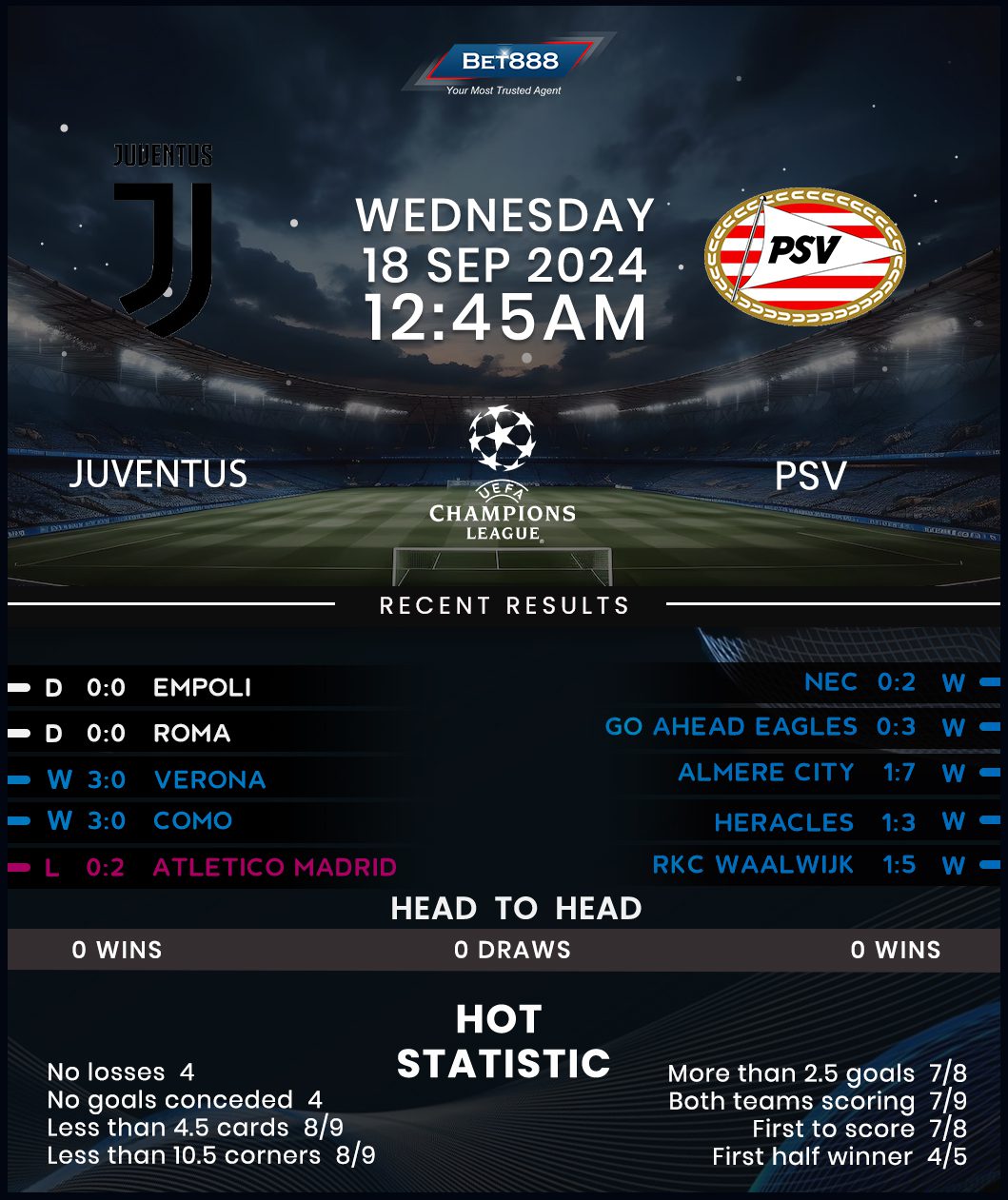 Allianz Stadium is the venue as Juventus and PSV Eindhoven lock horns in their opening 2024/25 UEFA Champions League clash.
