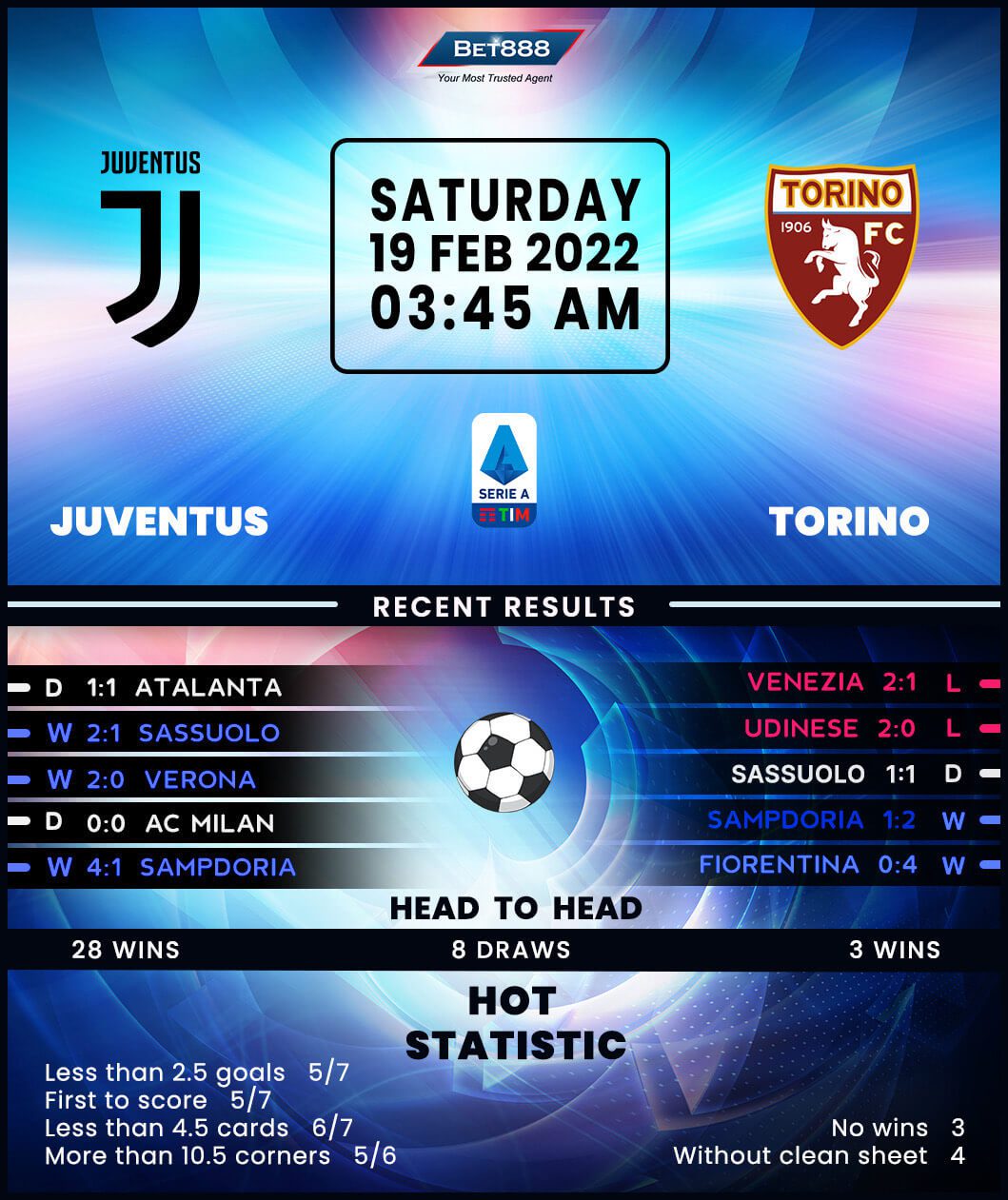Danilo’s last-gasp equaliser gave Juventus a 1-1 draw at Atalanta last time out, extending their unbeaten run in Serie A to 11 matches (W7, D4). Low scoring has been a common theme in that 11-game sequence, with just one of those fixtures featuring over 2.5 total goals. Interestingly, seven of Juventus’ last eight Serie A victories have yielded the same 2-0 scoreline, with Massimiliano Allegri’s side scoring either side of half-time on each occasion. That has also been the case in Juve’s last two top-flight home outings as they now aim to make it three consecutive home league wins ‘to nil’ under Allegri for the first time since December 2018. ‘I Bianconeri’ are in a prime position to achieve that feat after losing just one of their last 31 Serie A meetings with Torino (W23, D7).