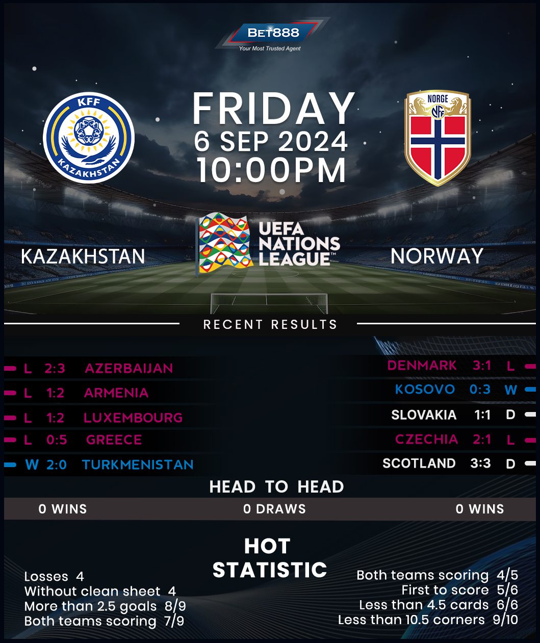 Yet to reach a major international tournament as an independent nation, Kazakhstan failed to qualify for Euro 2024 after losing to Greece in the playoffs, resulting in a managerial change over the summer. Former Russia head coach Stanislav Cherchesov took charge of the national team in June but slumped to two consecutive friendly defeats to Armenia and Azerbaijan at the beginning of his tenure. Both matches featured over 2.5 goals and both teams on the scoresheet, underscoring the potential for a high-scoring contest. However, those defeats have extended Kazakhstan’s losing streak to four matches, casting doubt on their hopes of toppling Norway in the first-ever meeting between the teams. The Hawks are gearing up for their maiden League B appearance after earning promotion from League C last term as Group 3 winners (W4, D1, L1).
