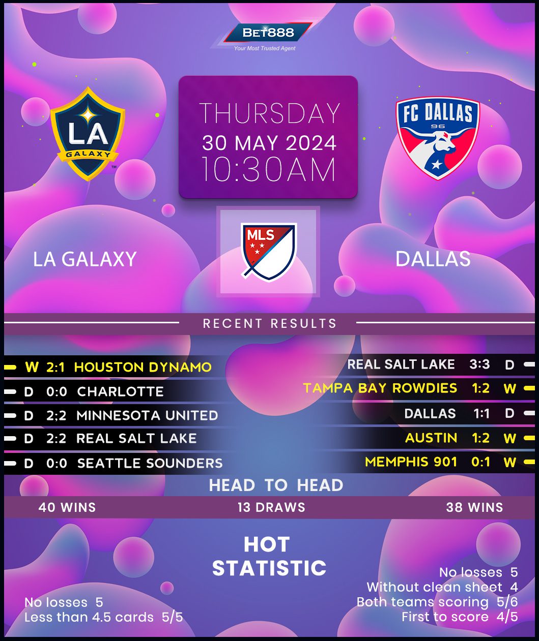 In the meantime, since a 3-1 defeat at Toronto FC at the start of May, visiting Dallas have into overdrive, racking up a five-game unbeaten run in all competitions (W3, D2), with each match seeing the sides separated by under 1.5 goals. Dallas proved their playoff credentials in the last round with a bitter-sweet 3-3 home draw against Western Conference table-toppers Salt Lake, dropping a three-goal cushion beyond the hour mark. Now leaving the comforts of their home venue, Nico Estevez’s men head to California in pursuit of their first away league win this season (D2, L4), drawing inspiration from two consecutive multi-goal margin victories on Galaxy’s home ground.