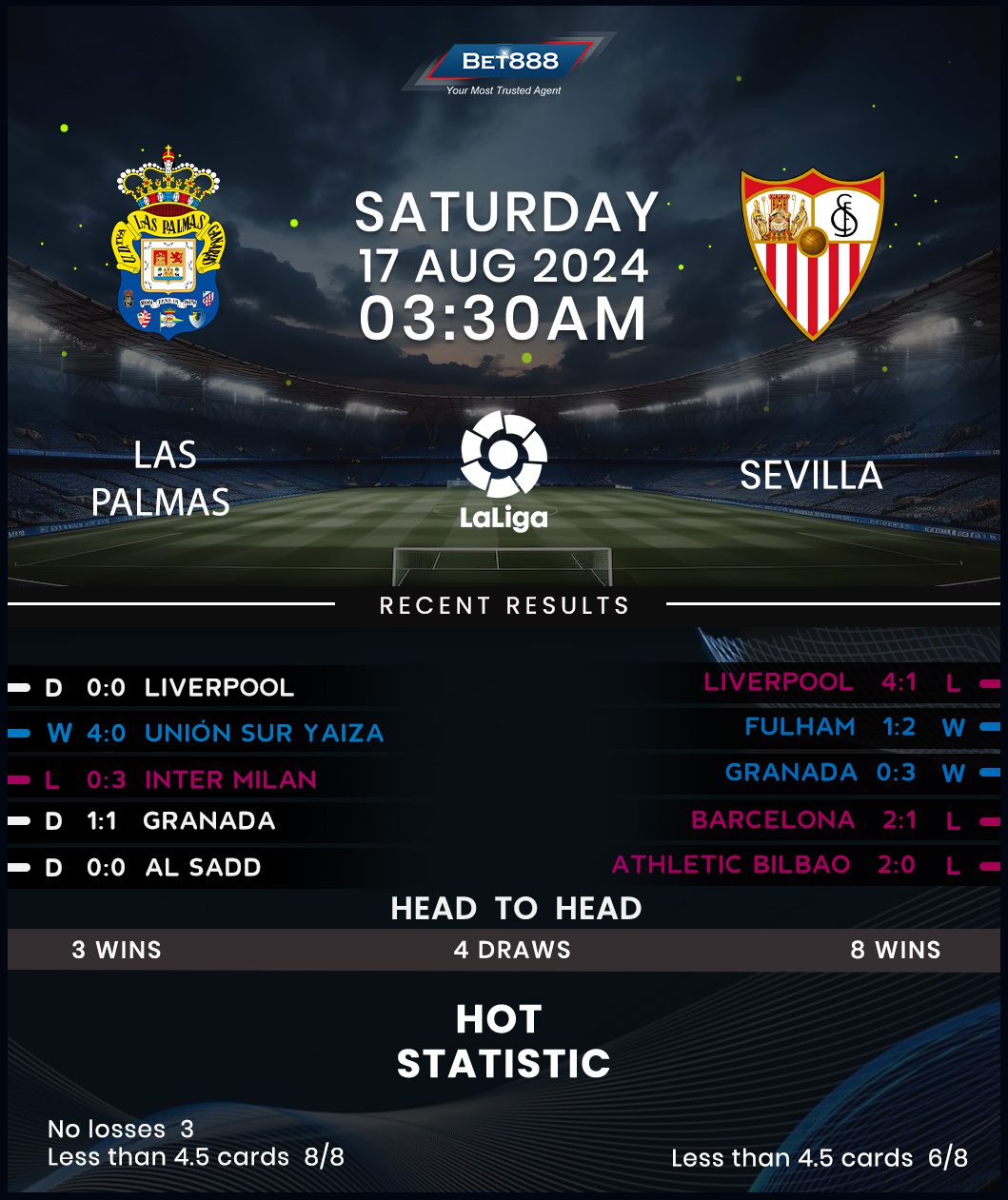 New Sevilla manager Garcia Pimienta left Las Palmas in tatters toward the end of his tenure at the Estadio Gran Canaria. An underwhelming 14-match winless league streak (D5, L9) down the final stretch of last season proved the end of the road for Pimienta’s reign at Las Palmas, condemning the club to a disappointing 16th-place finish. Freshly-appointed manager Luis Carrion bids to inspire Los Amarillos to a more promising start to the new campaign and potentially help Las Palmas post their first home league win since February (D3, L4) on his competitive debut. Confidence stems from holding Liverpool to a scoreless draw at Anfield in their final warm-up game. However, Las Palmas’ struggles in this fixture are long-standing, with Sevilla beating them in all seven top-flight H2Hs since 2016.