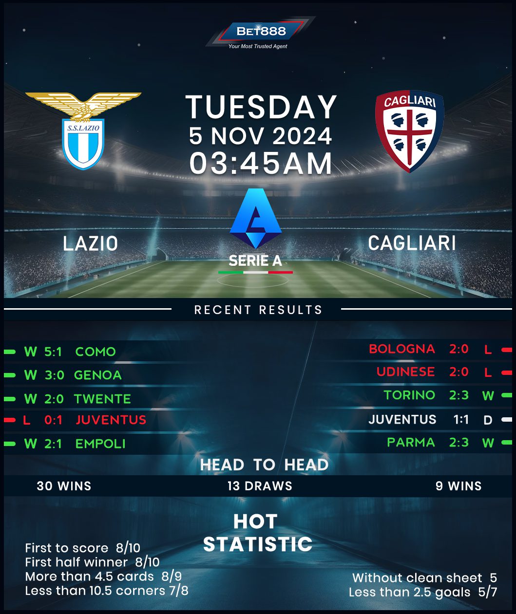 Stadio Olimpico is the venue as high-flying Lazio and out-of-sorts Cagliari go head-to-head in a lopsided Serie A encounter.