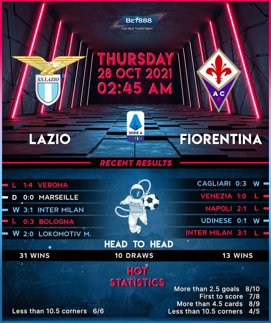 On the other hand, Fiorentina put Cagliari to the sword over the weekend, claiming a comprehensive 3-0 home triumph to bounce back from a two-match losing run in Serie A. Interestingly, the visitors remain one of just two sides yet to draw a Serie A match this term (W5, L4), with their last four league away fixtures won/lost (W3, L1) yielding a full-time margin of a single goal. Despite scoring a paltry average of 1.2 goals per away league game and already losing one Serie A fixture at the Stadio Olimpico this season (2-1 to Roma on Matchday 1), ‘La Viola’ will try to avoid suffering back-to-back Serie A away defeats for the first time since February.