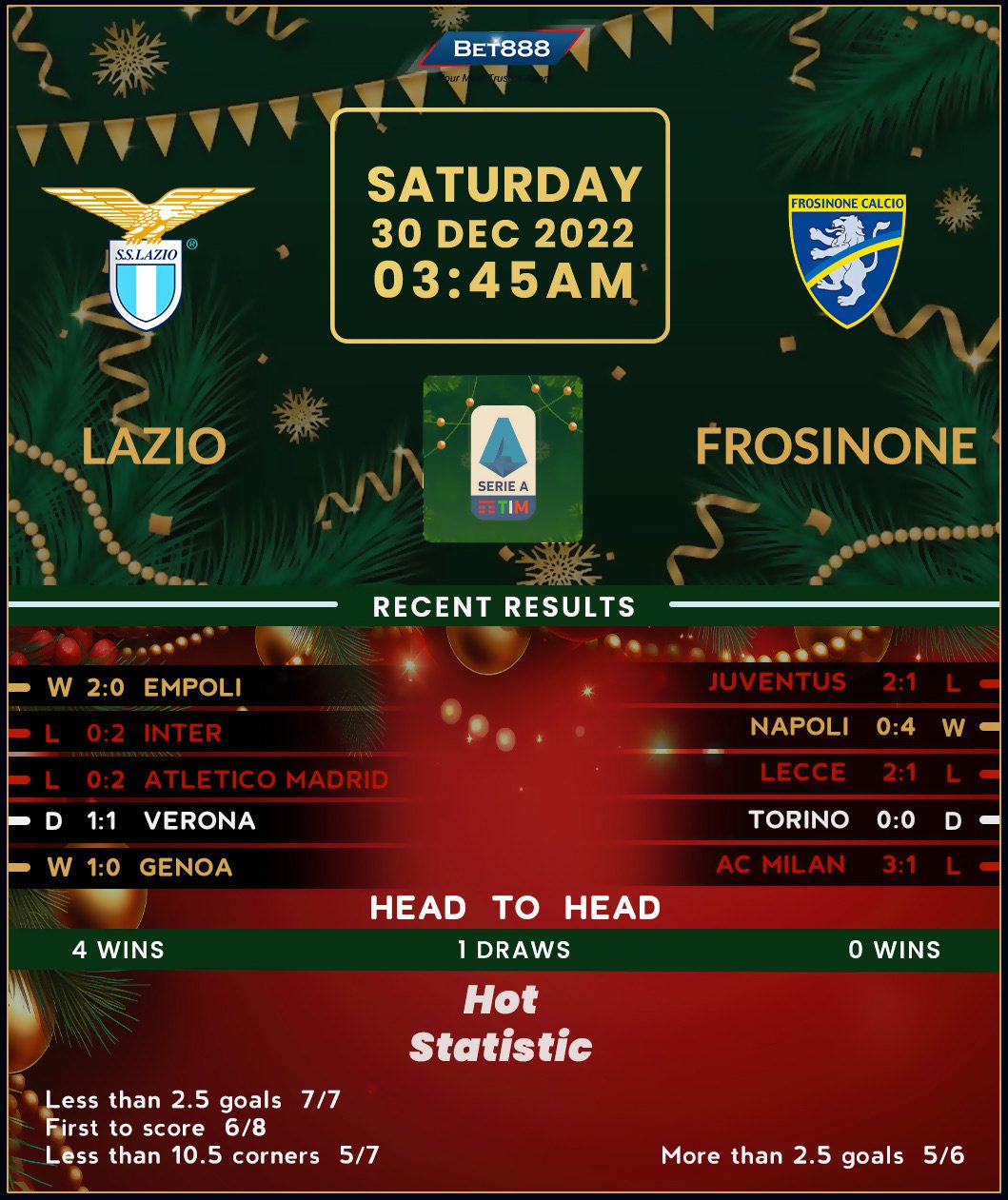 No matter how this contest ends, Lazio will enter the new calendar year outside the European qualification places following a disheartening form across the opening 17 Serie A rounds (W7, D3, L7). However, ‘I Biancocelesti’ will at least hope to piece together back-to-back league wins for the first time since October after putting Empoli to the sword last time out (2-0). Despite ending a two-game winless run at Carlo Castellani (D1, L1), that victory came at a hefty price as Maurizio Sarri lost his standout performers, Ciro Immobile and Luis Alberto, to injuries. Lazio can still find a safe shelter at the Olimpico, even though a 2-0 defeat to Inter Milan in their last home outing knocked them down from a six-game unbeaten league streak on home soil (W4, D2).