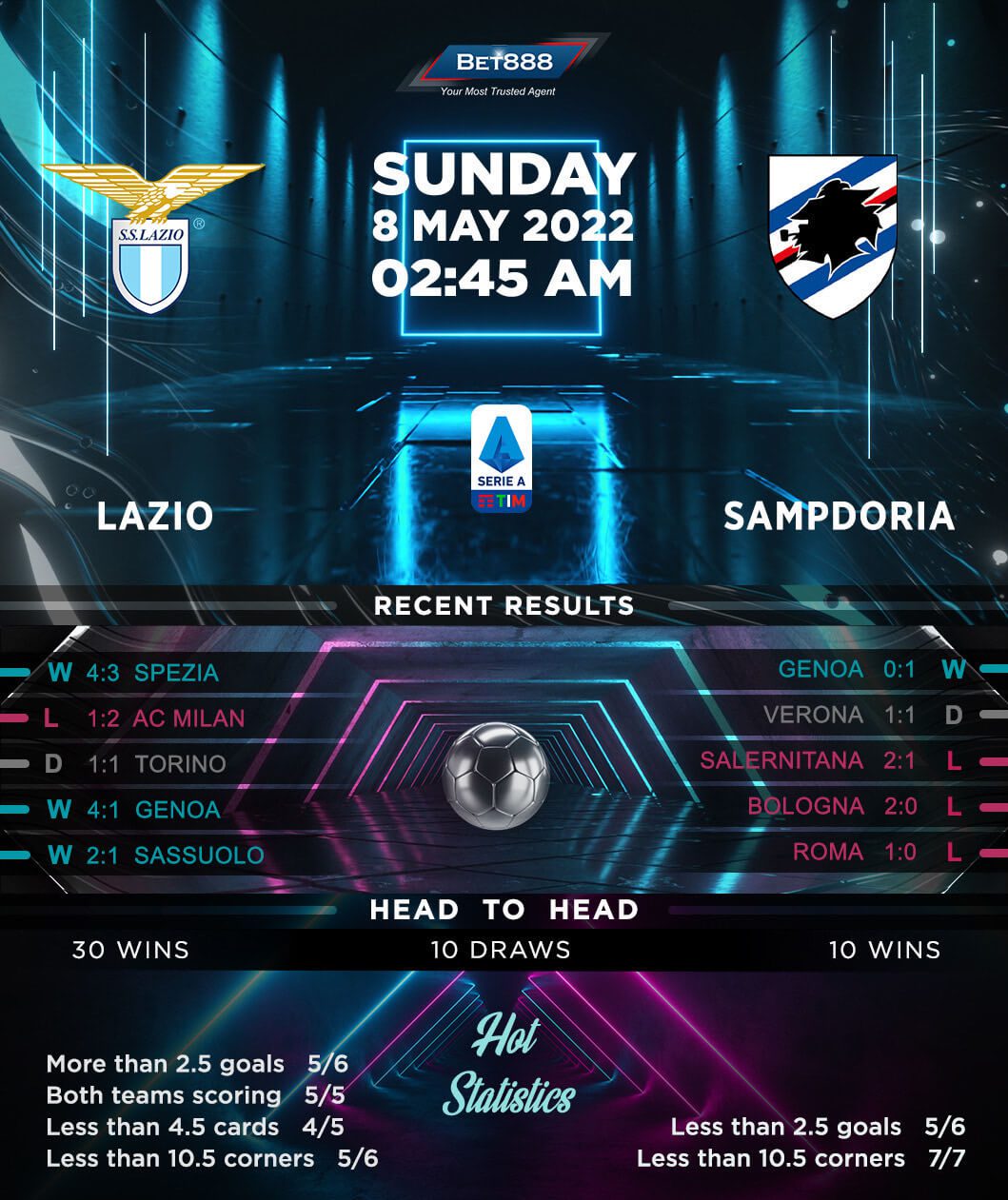 An indifferent three-game Serie A form (W1, D1, L1) has thrown Lazio’s Europa League hopes into doubt, though ‘I Biancocelesti’ could draw confidence from an outstanding come-from-behind 4-3 win at Spezia last time out. A return to the Stadio Olimpico would be a massive confidence booster for Maurizio Sarri’s side in normal circumstances, yet Lazio are winless in their last two home league matches (D1, L1). After a heartbreaking 2-1 defeat to AC Milan in their most recent Serie A game at Olimpico, Lazio could lose back-to-back Serie A home fixtures for the first time since December 2020. The hosts will be confident of finding the back of the net at the very least, though, having failed to score in just one of their last 20 Serie A meetings with Sampdoria (W15, D3, L2).