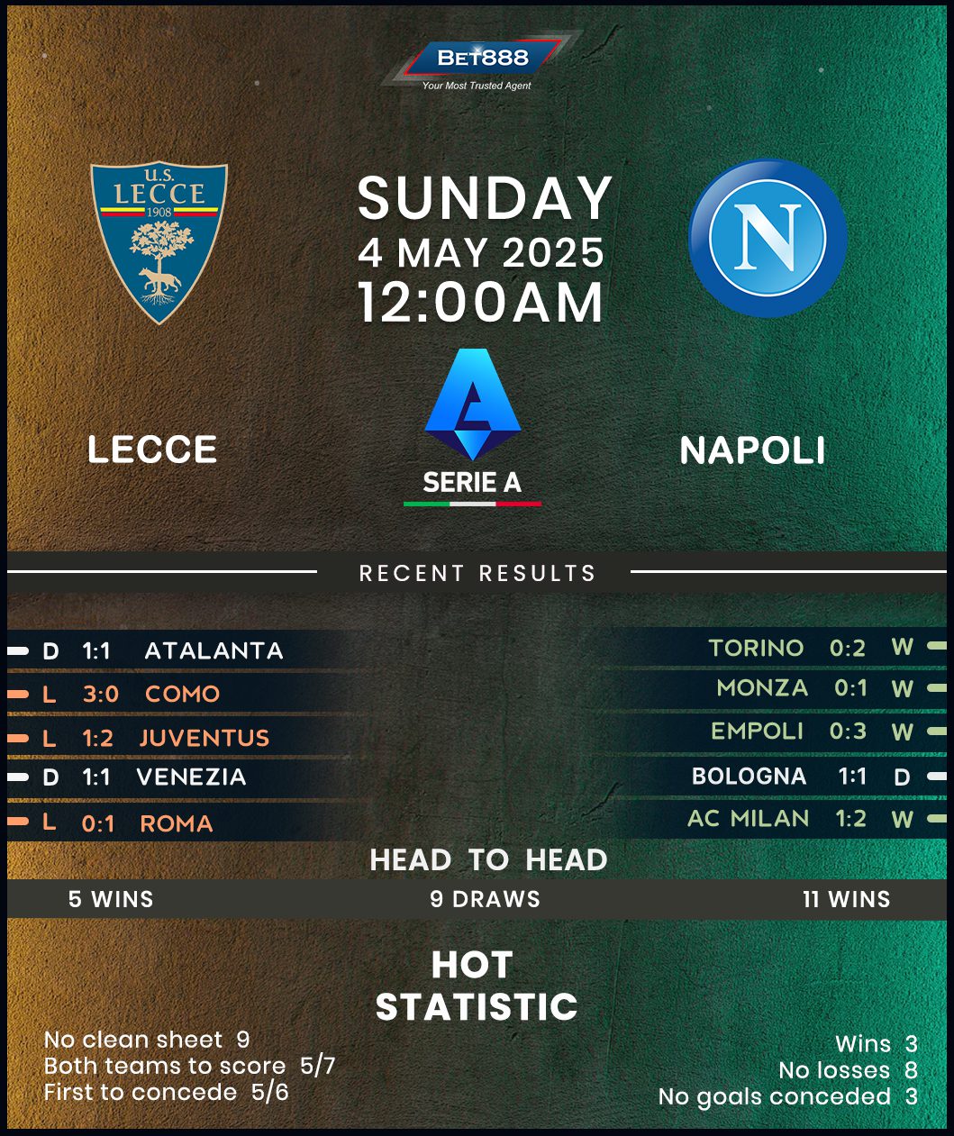 Serie A leaders Napoli head to Stadio Via del Mare to meet relegation-battling Lecce in a high-stakes Serie A encounter.