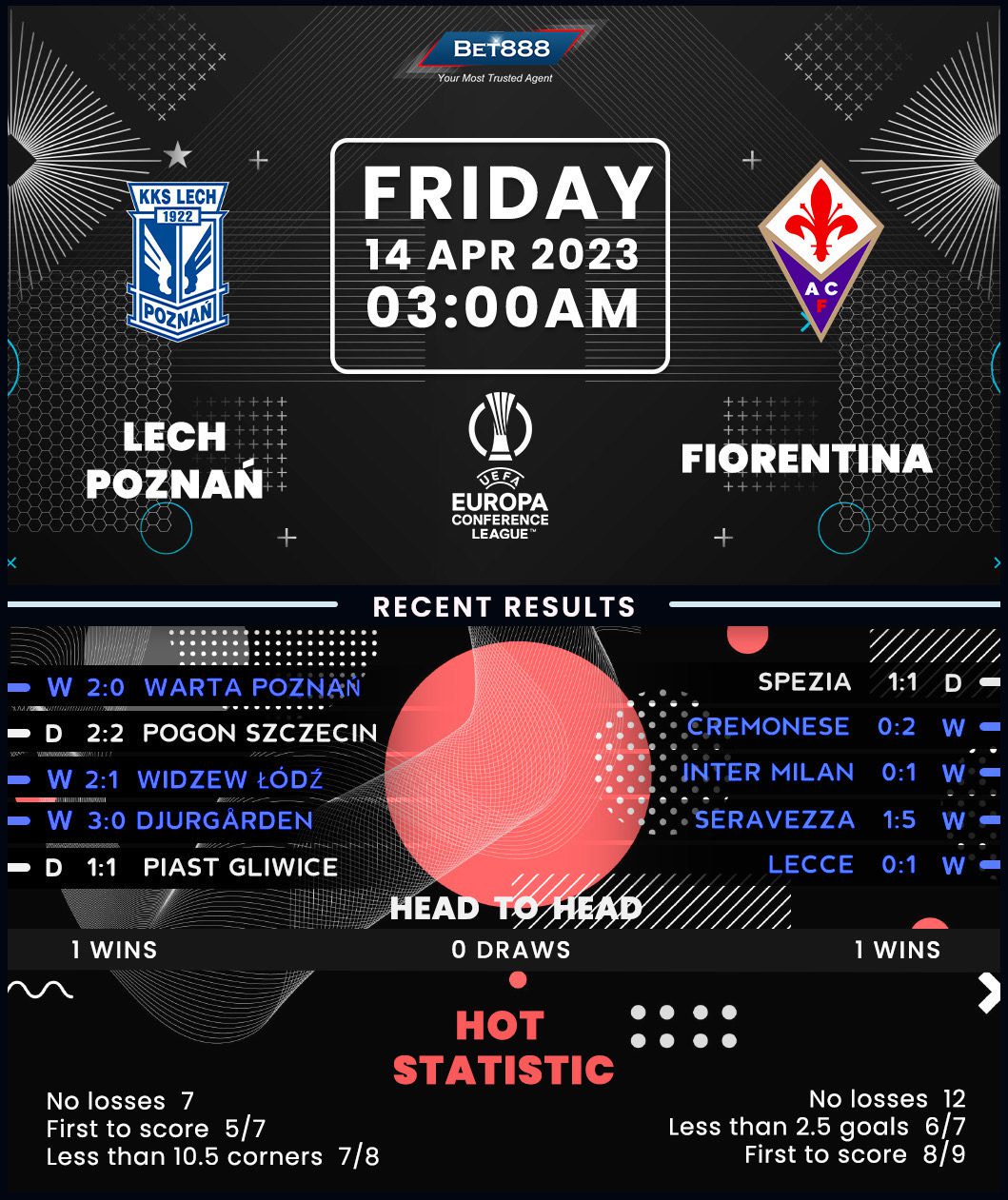 Meanwhile, Fiorentina had a glorious opportunity to win ten consecutive matches for the first time in club history but slipped to a 1-1 home draw against Serie A minnows Spezia at the weekend. The impending return to the continental stage could be a welcoming distraction, considering Vincenzo Italiano’s men have won their last eight Europa Conference League fixtures, netting an intimidating average of 3.13 goals per game during that period. Given Fiorentina’s unbeaten record in trips to Poland (W2, D1) and excellent recent form, the visiting team should feel confident going into this match. In addition, they have an impressive track record in major UEFA quarter-finals, having won seven out of their previous eight ties, including their last four.