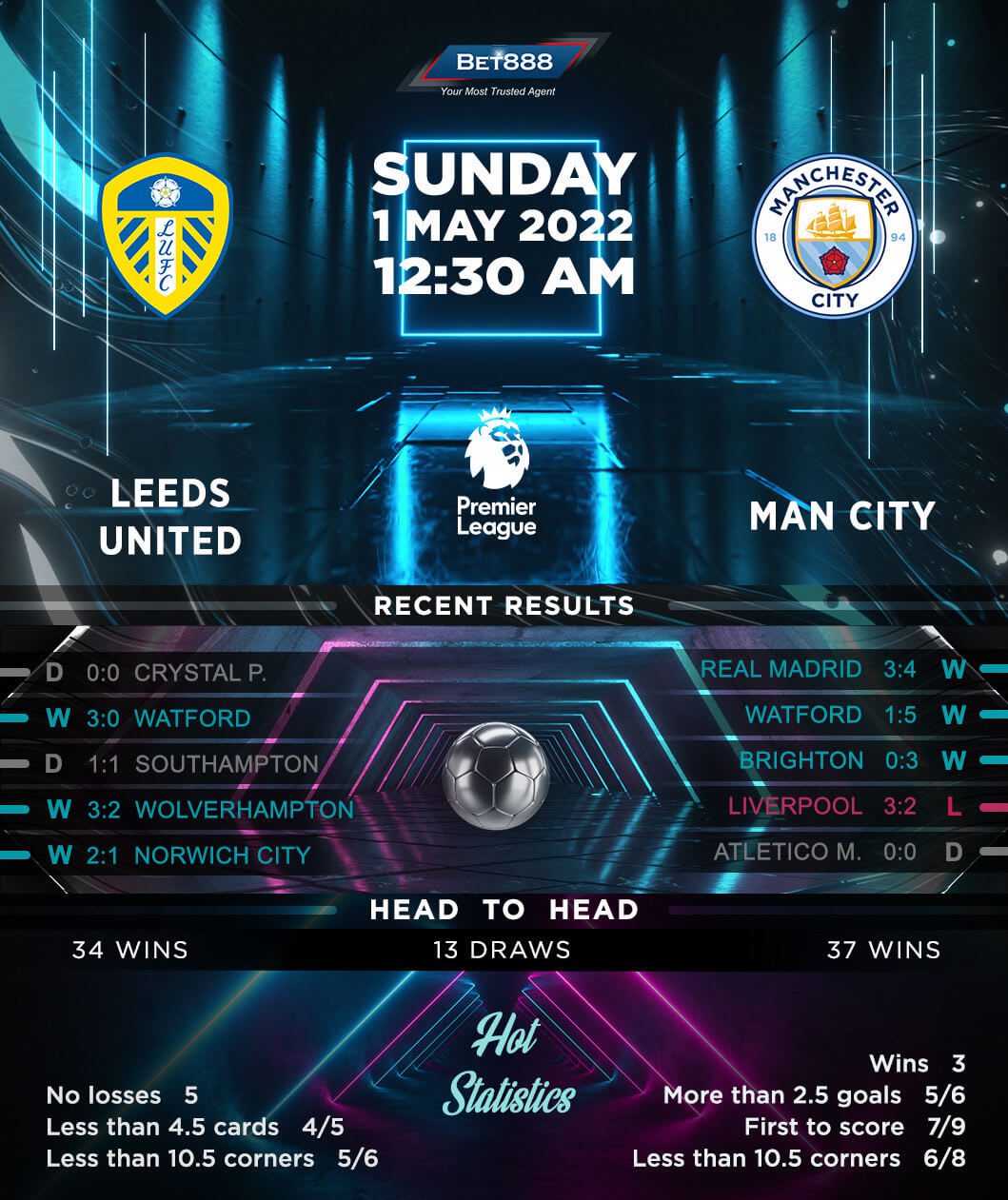 In the meantime, Manchester City will show up in a confident mood following a blockbuster 4-3 home triumph over Real Madrid in the first leg of their Champions League semi-final tie. The ‘Cityzens’ dismantled Leeds 7-0 in the reverse fixture at the Etihad Stadium and could complete their first league double over this opposition since 1981/82. Pep Guardiola’s men have no reason to doubt their ability to triumph at Elland Road in the Premier League for the first time since 2000, as they’ve flying high away from home this season. Since succumbing to a narrow 1-0 defeat at Tottenham Hotspur on the opening weekend, Man City have gone unbeaten in their remaining 15 Premier League away matches since (W12, D3), including three wins ‘to nil’ across their last four league travels (D1).
