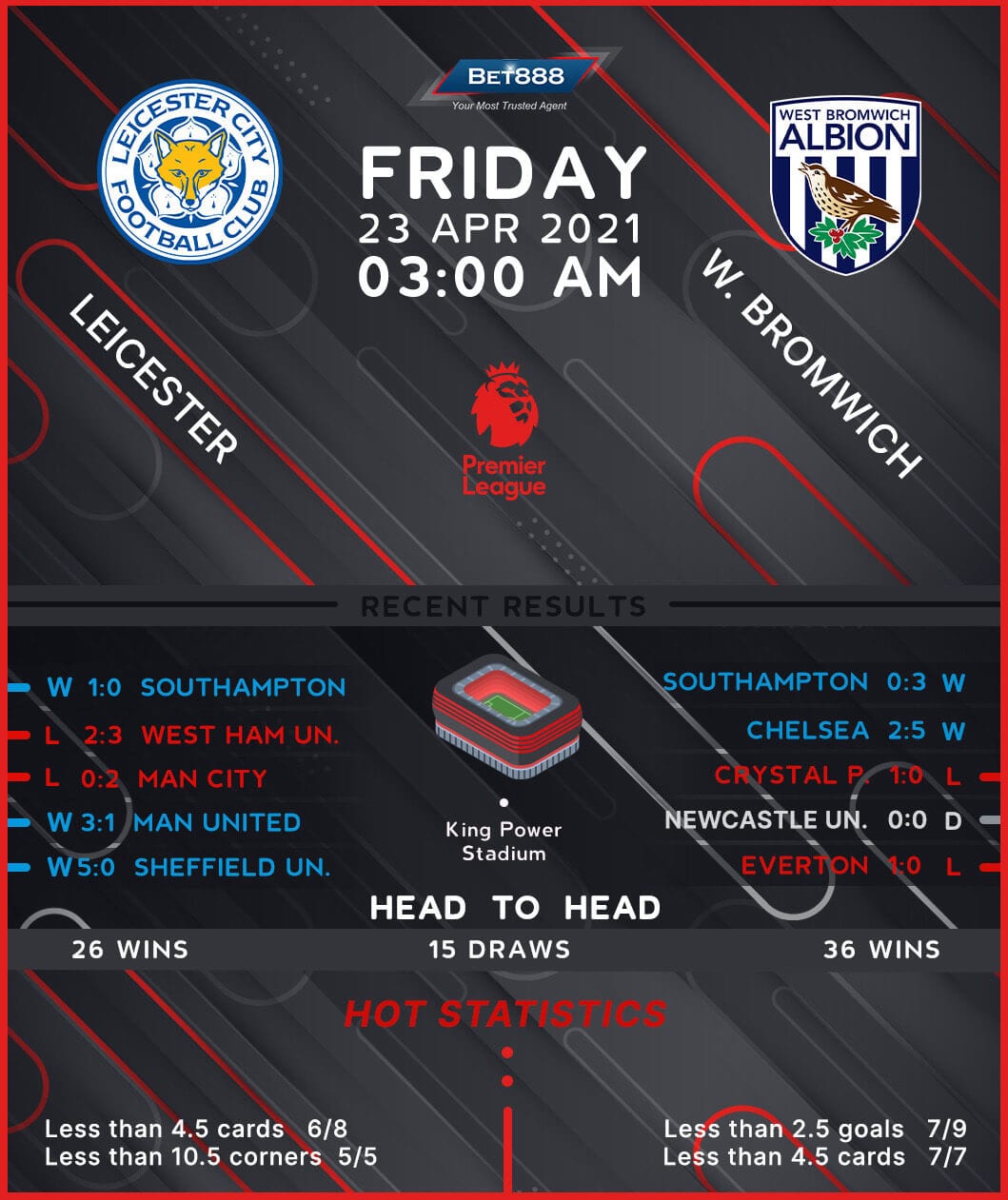 Despite beating Southampton 1-0 in their FA Cup semi-final tie back in the weekend, Leicester come into proceedings having lost back-to-back Premier League fixtures. The ‘Foxes’ have been ponderous in the first half recently, failing to score before half-time in three of their last four league matches – with eight of their nine strikes in that sequence coming in the second 45 minutes of play. Leicester’s home Premier League record this season is perfectly balanced (W7, D1, L7), with the solitary draw arriving against Manchester United in December 2020 (2-2). Interestingly, each of their seven home league matches since that stalemate with United has yielded a winning/losing margin of at least two goals (W4, L3). Brendan Rodgers’ men will now look to post their first-ever Premier League win over WBA at home (D2, L2).
