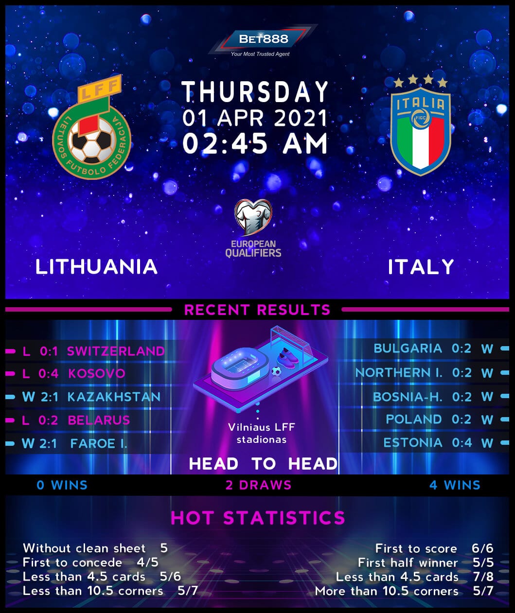 Meanwhile, Italy’s road to redemption for missing out on the FIFA World Cup 2018 started with back-to-back triumphs against Northern Ireland and Bulgari, both of which came via a 2-0 scoreline and saw the Italians score inside the final ten minutes of the first half. Curiously, Roberto Mancini’s men are now on a four-game winning streak in all competitions, with each success in that spread of fixtures coming by the same 2-0 score. Furthermore, ‘Gli Azzurri’ head into proceedings as overwhelming favorites to claim three points, having racked up a remarkable 24-match unbeaten run ahead of the kick-off (W19, D5). Away from home, the visitors have kept six consecutive clean sheets in various competitions (W5, D1), which has been the case in each of their three competitive visits to Lithuania (W2, D1).