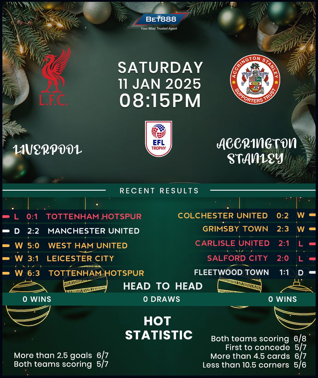 Liverpool’s title-defending EFL Cup campaign took a massive hit earlier this week as they slumped to a late 1-0 defeat at Tottenham in the first leg of their semi-final tie. Accrington’s upcoming visit to Anfield is a presentable opportunity for Arne Slot’s side to regain momentum after sharing the spoils with Manchester United in a nerve-shredding 2-2 draw in their last home outing. That result extended Liverpool’s unbeaten home streak in all competitions to 12 games (W10, D2). Needless to say, the Reds netted 2+ goals on each occasion, testifying to their unparalleled scoring prowess. However, the runaway Premier League leaders failed to keep a clean sheet in their last three home games, conceding precisely two goals twice.