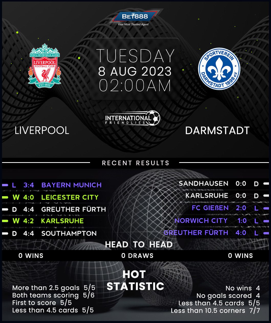 Liverpool enjoyed a stellar pre-season start, scoring precisely four goals in their opening three exhibition matches (W2, D1) before slumping to a goal-glutted 4-3 defeat to perennial Bundesliga champions Bayern Munich last time out. Regardless of that recent upset, Jurgen Klopp’s well-oiled machine continues to rain down goals, having netted at least three in five consecutive games in the build-up to this clash. Four of those five fixtures produced multiple first-half goals, highlighting the potential for a quick-fire start. Interestingly, two of Liverpool’s four summer friendlies have come against Darmstadt’s Bundesliga 2. rivals Greuther Furth and Karlsruher, both of which saw both sides score at least twice in matches garnering over 5.5 total goals.