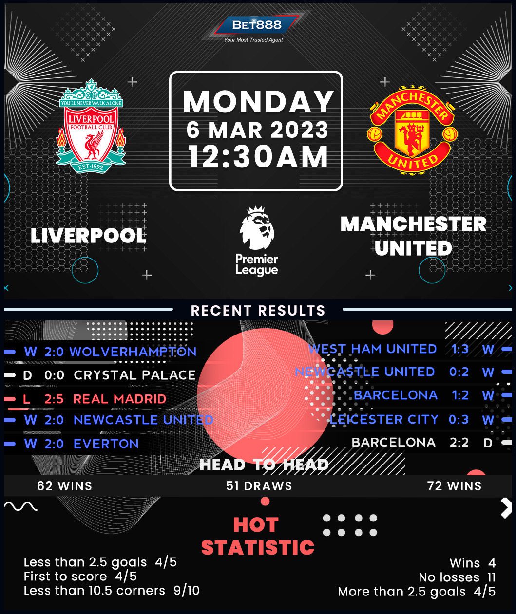 As for Manchester United, a come-from-behind 3-1 home win over West Ham United in midweek FA Cup action followed up the club’s first trophy under Erik ten Hag, with the ‘Red Devils’ dispatching Newcastle United 2-0 in last weekend’s League Cup final. Back to the Premier League, where they’ve racked up three wins in their last four matches (D1), the visitors are looking to consolidate their position in the top-four race by at least preserving an eight-point lead on fifth-placed Newcastle. Despite their woeful scoring form at Anfield of late, Man Utd can draw confidence from their recent attacking exploits, having scored in each of their last 15 league games.
