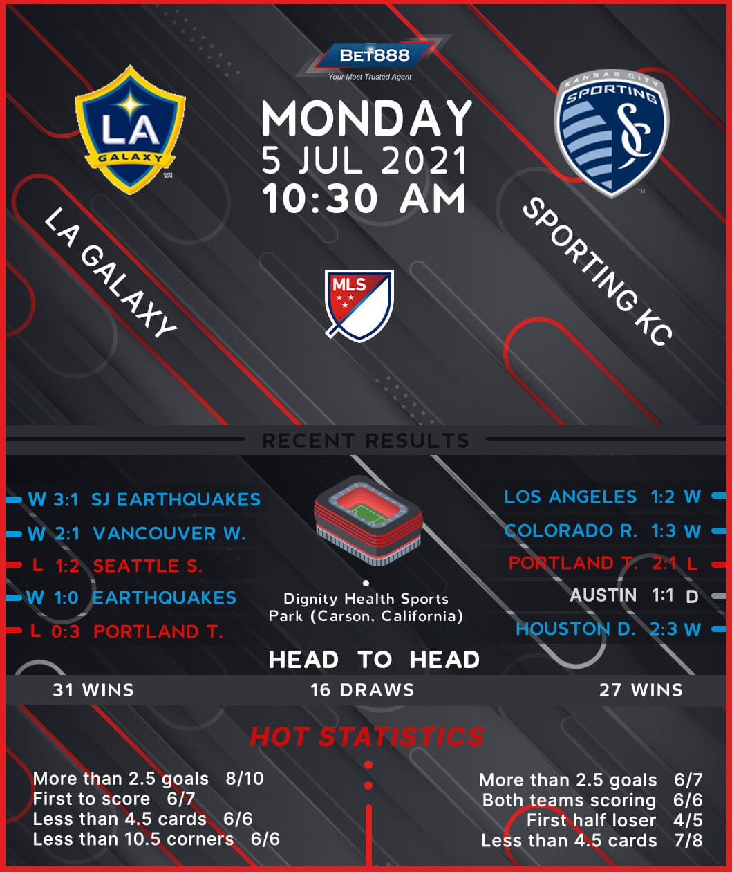 Los Angeles Galaxy will play host to Sporting Kansas City at Dignity Health Sports Park, looking to stretch their unbeaten H2H run in MLS to four games (W2, D1).