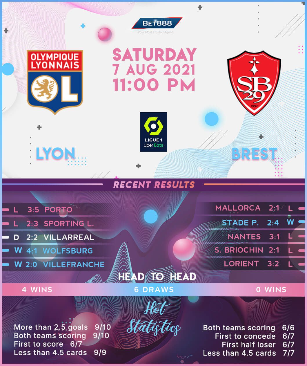 Visitors Brest finished just one point and one place above the relegation territory in 2020/21 thanks to an underwhelming end of the season that saw them fail to win any of their final four Ligue 1 matches (D1, L3). Couple that with the fact Brest’s previous eight opening games of a new top-flight season have returned zero wins (D4, L4), and a promising start to the 2021/22 campaign looks unlikely. What’s more, Michel Der Zakarian’s men have claimed just one victory in their last 13 away Ligue 1 outings (D4, L8), conceding 2+ goals 53.85% of those clashes. Moreover, ‘Les Pirates’ have failed to beat Lyon in any of their nine Ligue 1 away H2Hs overall (D2, L7), drawing a blank in four of their last six top-flight trips to the Groupama Stadium.