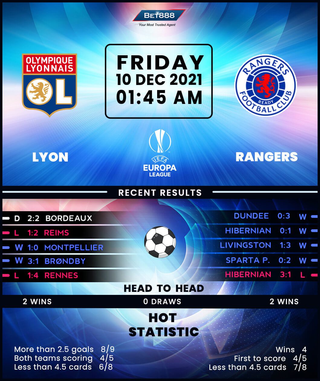 Meanwhile, Rangers have bounced back from a dreadful Europa League start that had seen them lose their opening two Group A fixtures without scoring. The ‘Gers’ have gone unbeaten in their last three matches in the competition (W2, D1), with both victories yielding the identical 2-0 scoreline. Having secured a runner-up finish with a game to spare, new manager Giovanni van Bronckhorst will be looking to maintain his 100% start to life at Ibrox (W4). Since replacing Steven Gerrard in the dugout in late November, the Dutch strategist has led Rangers to three clear-cut victories, barring a 1-0 away win at domestic rivals Hibernian. That should encourage the visitors’ bid to improve their indifferent away record in the Europa League (W2, D4, L4). Curiously, though, they are the only Scottish side to have beaten Lyon in France.