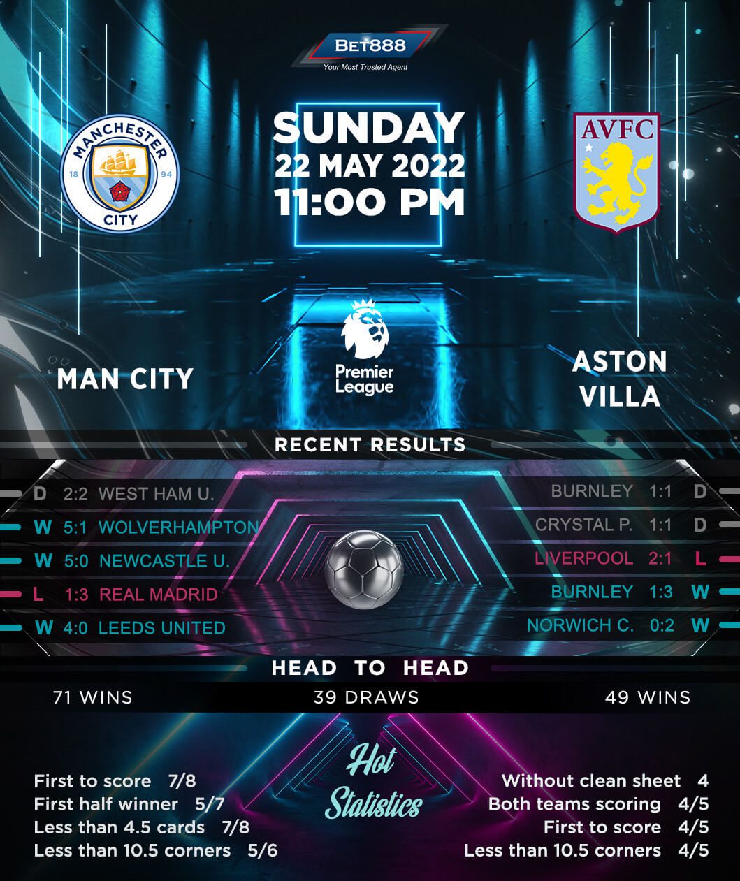 Manchester City are on the verge of winning their fourth Premier League title in five years, though they have yet to finish the job. Coming into the ultimate round of fixtures, the ‘Cityzens’ hold a single-point lead on second-placed Liverpool and need to beat Villa to secure the title regardless of the Reds’ result against Wolverhampton Wanderers. Pep Guardiola’s men have been ruthless against Villa, winning nine of their last ten top-flight H2Hs (D1), including the last six on the spin. Additionally, since a dismal 3-2 loss to Tottenham Hotspur in mid-February, Man City have gone unbeaten in their subsequent five home Premier League matches (W4, D1), winning the last three in a row by an aggregate score of 13-1. Home and away, the reigning English champions have lost just one of their 27 previous Premier League games (W22, D4).