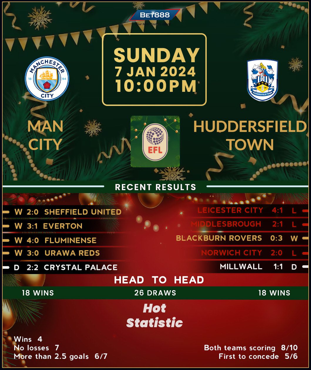 Manchester City’s FA Cup title defense starts in the midst of a purple patch. Fresh off lifting their first FIFA Club World Cup title, Pep Guardiola’s all-conquering side won back-to-back Premier League matches toward the end of 2023, overcoming Everton and Sheffield United by a two-goal margin. Guardiola, who boasts a telling six-game unbeaten H2H record versus Huddersfield (W4, D2), encompassing a 5-1 demolition in the FA Cup, could rotate his squad despite the Premier League break. The Spaniard would appreciate a more resilient defensive performance for a change after the ‘Citizens’ failed to keep a clean sheet in nine of their last ten matches outside the Club World Cup (W5, D4, L1). Huddersfield could be a perfect victim, considering Man City have shut out the ‘Terriers’ twice in their three most recent H2Hs (W2, D1).