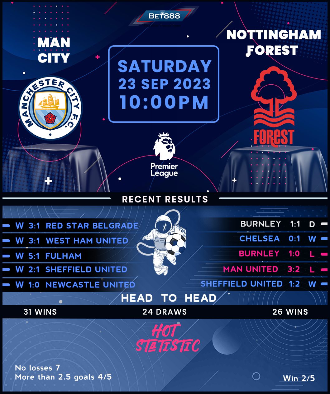 Manchester City’s Champions League title defense was off to a flying start earlier this week as they came from behind to thump Red Star Belgrade 3-1 at home in their opening Group G encounter, translating their superb domestic form to the European front. Indeed, Pep Guardiola’s high-flyers have won all five Premier League matches this season, including a come-from-behind 3-1 victory at West Ham last weekend, making a solid case for a potentially record-breaking campaign. Keen to become the first-ever side to win four consecutive Premier League titles, the ‘Citizens’ come into proceedings in the midst of an eye-catching 12-game winning league run on home soil, bookended by a 5-1 rout of Fulham on the stroke of September’s international break. Another standout success is on the cards, with Man City winning their last three home league H2Hs against Forest ‘to nil.’