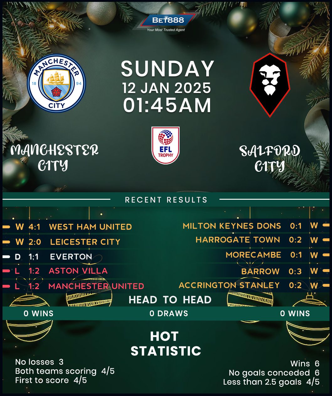 However, that’s not a foregone conclusion, considering the visitors head into proceedings amid an impressive six-match winning streak in League Two, bookended by a brace of victories ‘to nil’ at Harrogate and MK Dons at the start of the new calendar year. Winning without conceding has been Salford’s ‘thing’ lately, as their last eight triumphs have come without reply. But their defensive solidity will be tested at the Etihad against one of Europe’s most formidable opposition, though the Ammies can draw heart from conceding an average of only 0.4 goals per game across their last five away matches (W3, D1, L1). Each contest in that sequence featured under 2.5 total goals, suggesting a low-scoring fixture could be in store.