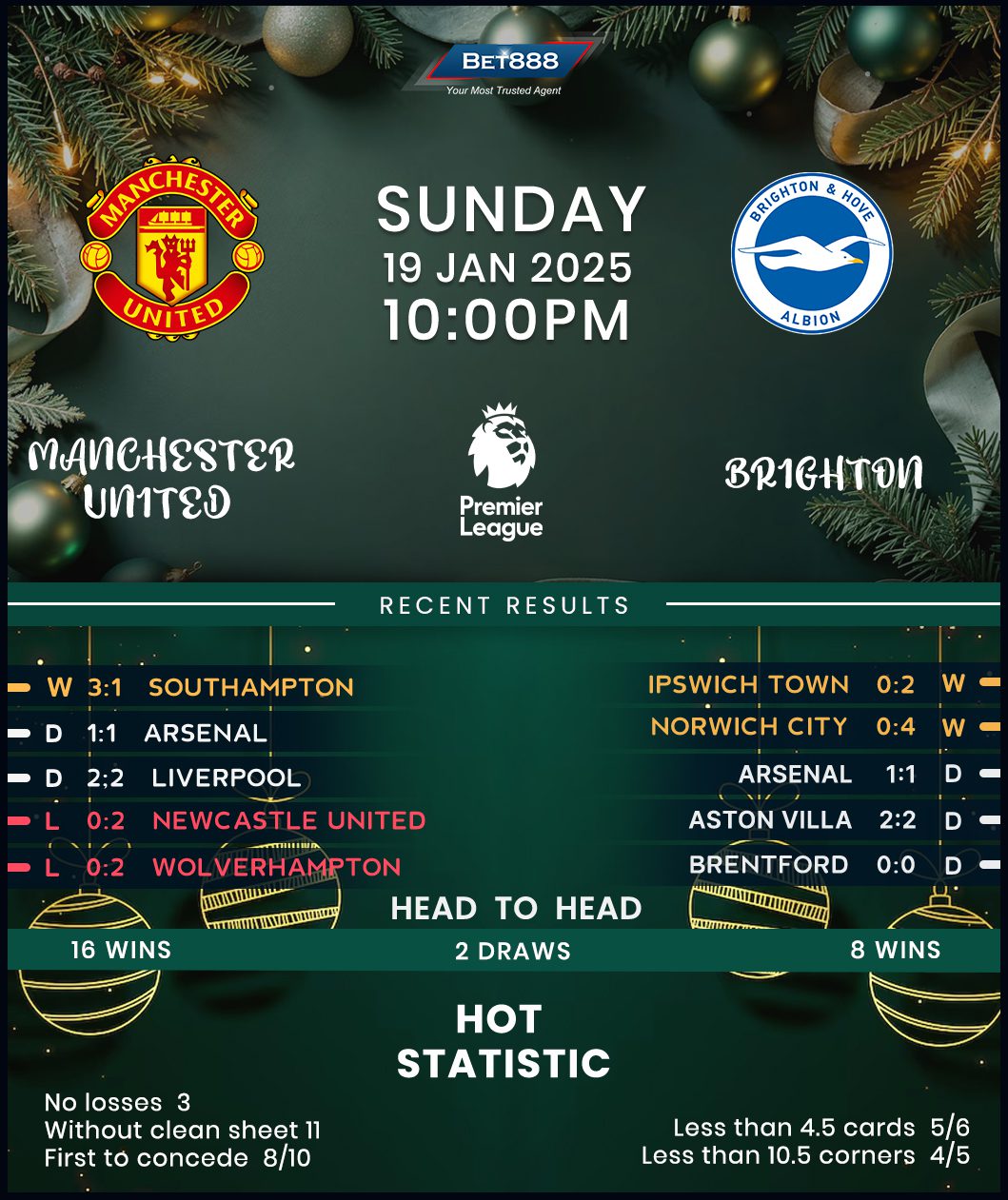 On the other hand, Brighton finally halted their underwhelming eight-game winless run in the Premier League during midweek (D6, L2), dispatching newly promoted Ipswich Town 2-0 on the road to sneak into the upper half of the table pre-round. It was also Brighton’s first away league win in six matches (D4, L1) and their first clean sheet outside East Sussex since a narrow 1-0 victory at Newcastle United in mid-October. Interestingly, Fabian Hurzeler’s men have amassed 16 of their 31 top-flight points this season away from home, suggesting another success at the Theater of Dreams isn’t beyond them. Adding to this sentiment, the Seagulls boast a remarkable 47% win ratio against Man Utd in the Premier League – a feat unmatched in the division’s history.