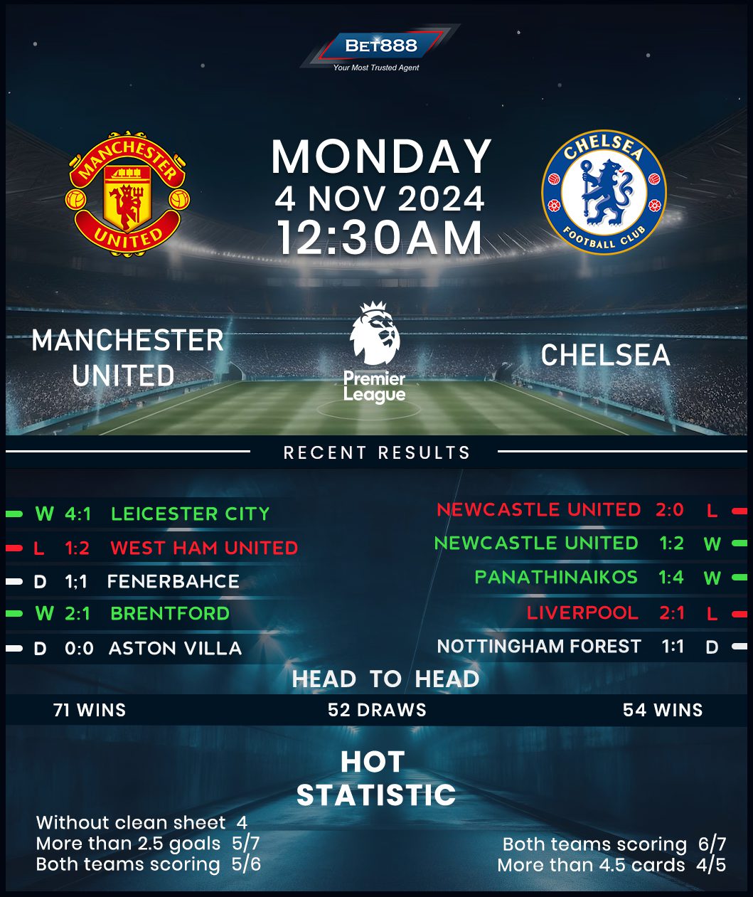 A 2-1 defeat at West Ham last weekend was the final straw as Manchester United sacked manager Erik ten Hag the following day amid the club’s worst-ever nine-game start in the Premier League (W3, D2, L4). Interim boss Ruud van Nistelrooy enjoyed a dream debut, with the Red Devils thrashing Leicester City 5-2 in midweek EFL Cup action to set themselves up nicely for this fixture. They’ve gone unbeaten in their last 11 home league meetings with Chelsea (W5, D6) and could win three consecutive H2Hs at Old Trafford for the first time since 1957. That’s perhaps easier said than done, considering they’ve lost twice in their last three home league outings, with Liverpool and Tottenham posting identical 3-0 victories at the Theatre of Dreams down the final stretch of Ten Hag’s regime.